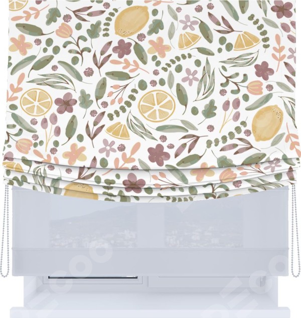 Римская штора «Кортин», день-ночь с мягкими складками, «Лимоны и цветы»