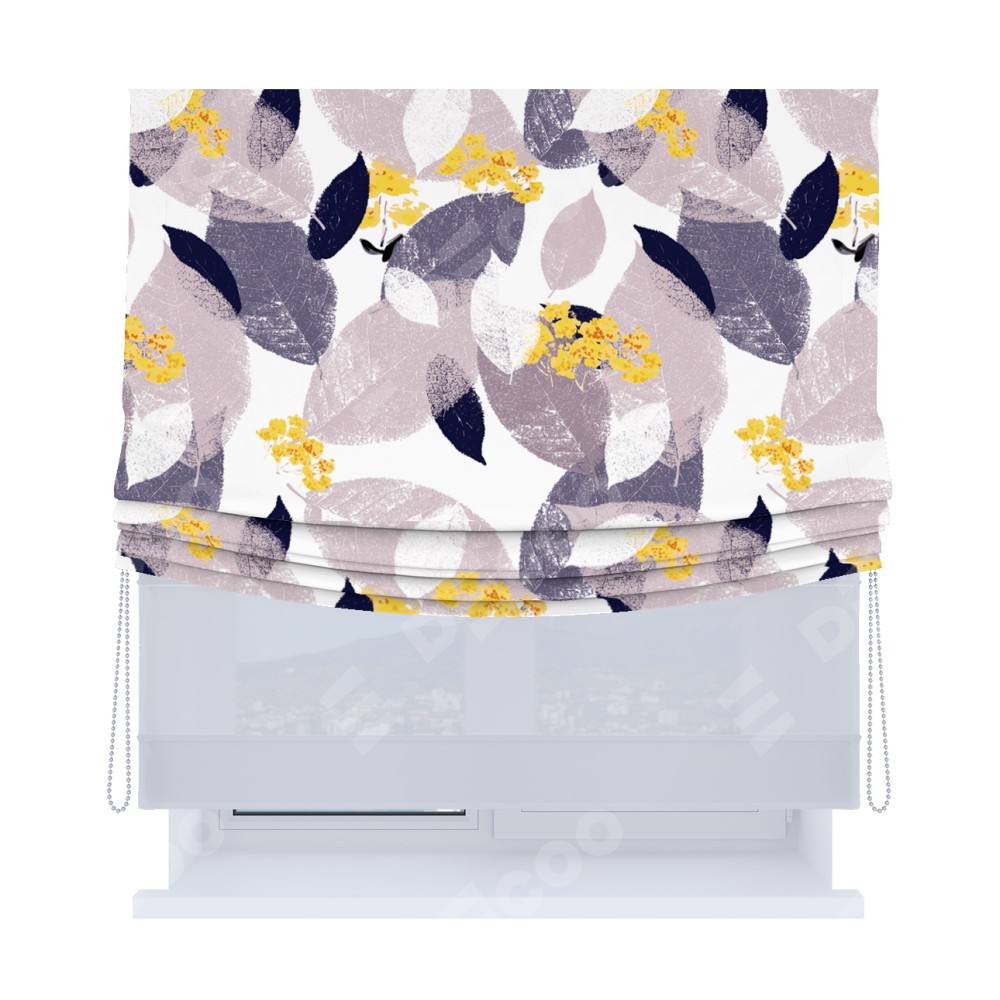 Римская штора день-ночь производителя «Cortin», используется для проёма, пошита из двух полотен, с лицевой блэкаут с нанесением сублимационной печати «Листопад», вторая ткань тюль (по стандарту комплектуется тюль белого цвета артикул V-01). Имеет универсальный механизм и подходит для монтажа: на потолок, на стену и в нишу. Удобное управление каждой шторой отдельно.