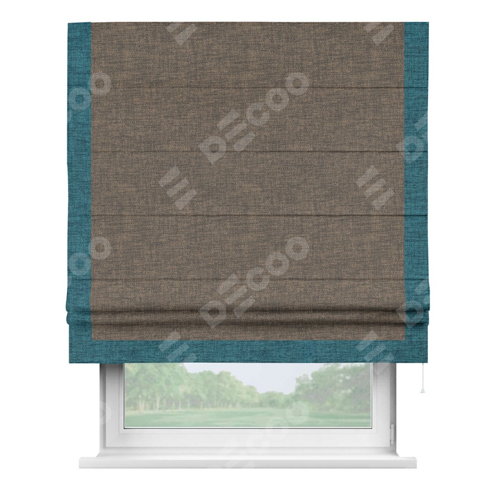 Римская штора производителя «Cortin», используется для проёма, пошита из ткани рогожка димаут коричневый, артикул 80420. Отделка шторы кантом «Виктория», ткань для канта используется из рогожки димаут разной расцветки на выбор. Имеет универсальный механизм и подходит для монтажа: на потолок, на стену и в нишу.
