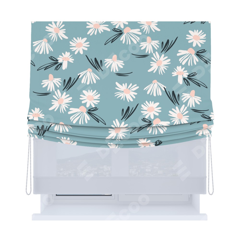 Римская штора день-ночь производителя «Cortin», используется для проёма, пошита из двух полотен, с лицевой блэкаут с нанесением сублимационной печати «Чудесные ромашки», вторая ткань тюль (по стандарту комплектуется тюль белого цвета артикул V-01). Имеет универсальный механизм и подходит для монтажа: на потолок, на стену и в нишу. Удобное управление каждой шторой отдельно.