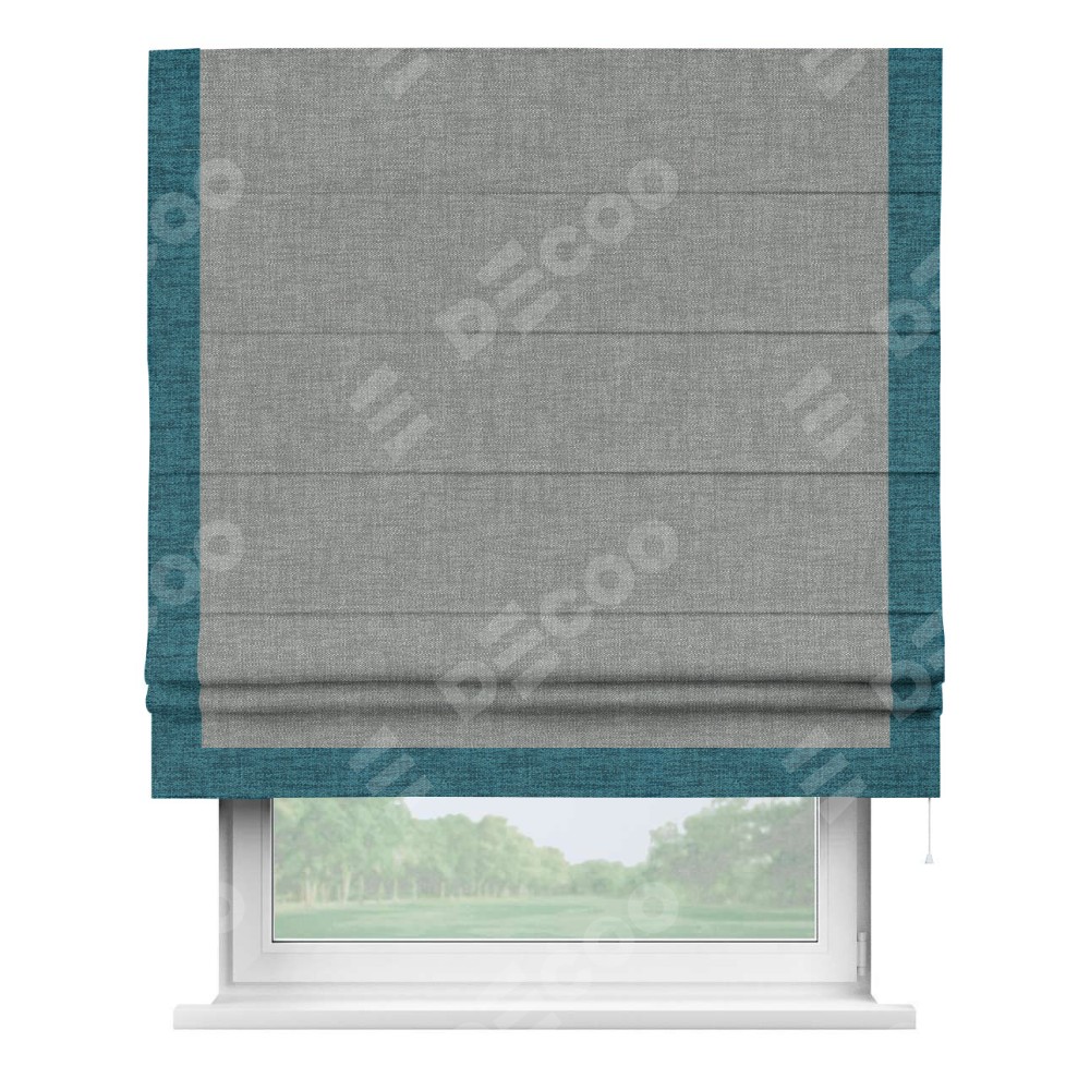 Римская штора производителя «Cortin», используется для проёма, пошита из ткани рогожка димаут тёмно-серый, артикул 80418. Отделка шторы кантом «Виктория», ткань для канта используется из рогожки димаут разной расцветки на выбор. Имеет универсальный механизм и подходит для монтажа: на потолок, на стену и в нишу.