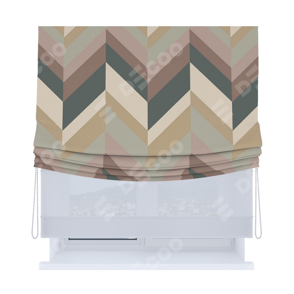 Римская штора день-ночь производителя «Cortin», используется для проёма, пошита из двух полотен, с лицевой блэкаут с нанесением сублимационной печати «Шеврон Авеню», вторая ткань тюль (по стандарту комплектуется тюль белого цвета артикул V-01). Имеет универсальный механизм и подходит для монтажа: на потолок, на стену и в нишу. Удобное управление каждой шторой отдельно.