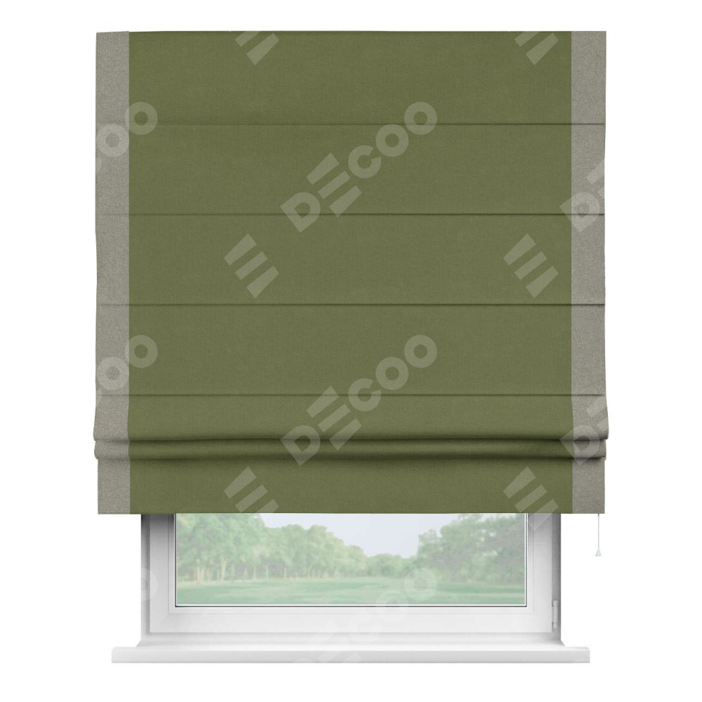 Римская штора производителя «Cortin», используется для проёма, пошита из ткани лён блэкаут оливковый, артикул 69516. Отделка шторы кантом «Стрим Дуо», ткань для канта используется из льна разной расцветки на выбор. Имеет универсальный механизм и подходит для монтажа: на потолок, на стену и в нишу.