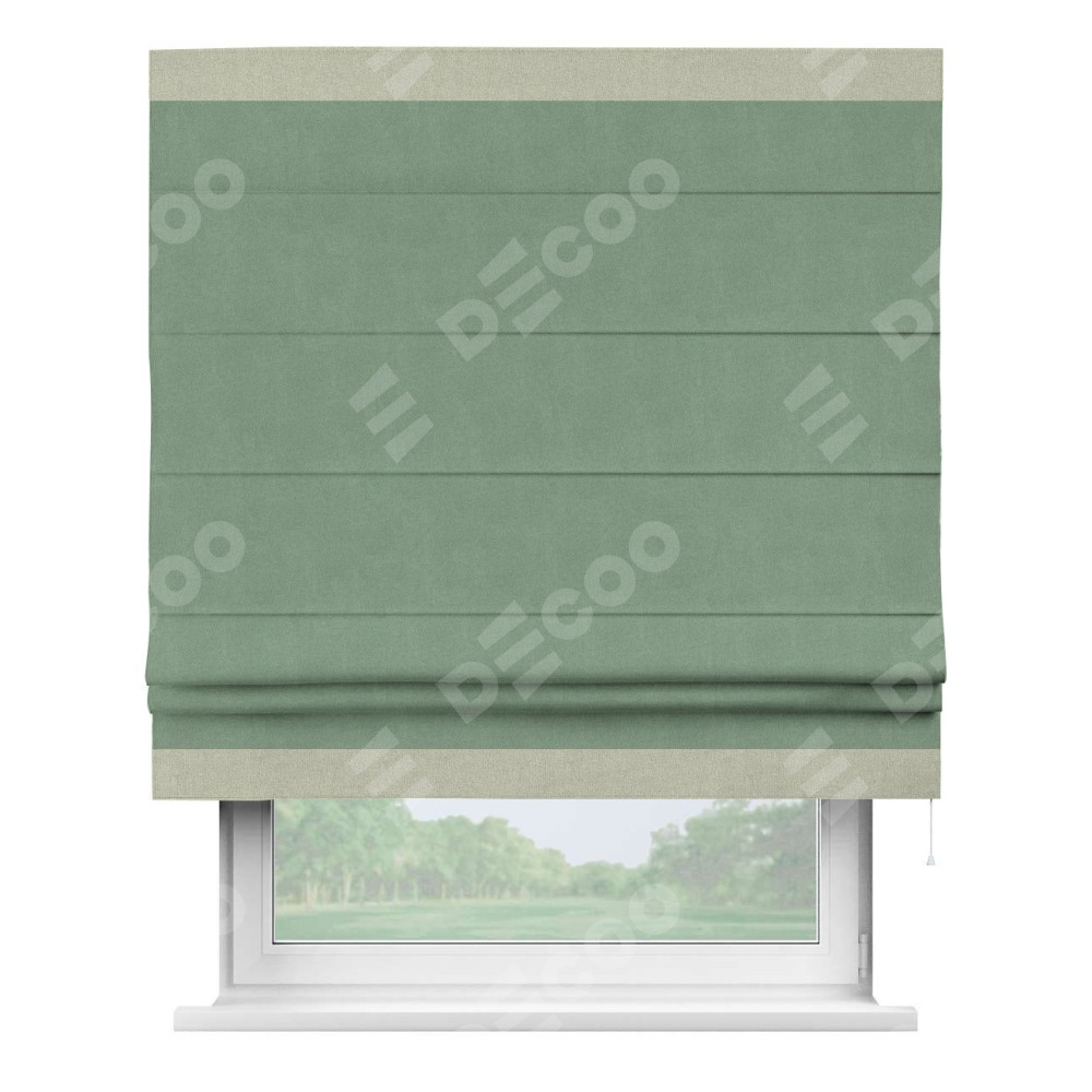 Римская штора производителя «Cortin», используется для проёма, пошита из ткани лён блэкаут светло-бирюзовый, артикул 69443. Отделка шторы кантом «Горизонт», ткань для канта используется из льна разной расцветки на выбор. Имеет универсальный механизм и подходит для монтажа: на потолок, на стену и в нишу.