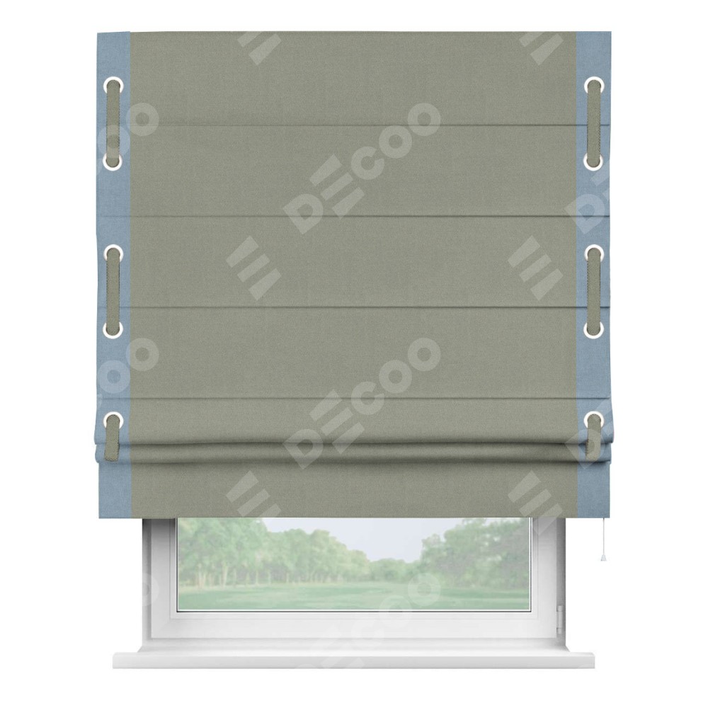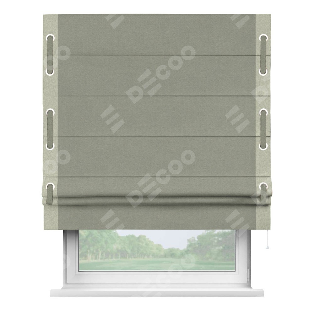 Римская штора производителя «Cortin», используется для проёма, пошита из ткани лён блэкаут светло-серый, артикул 69446. Отделка шторы кантом «Стрим Дуо» на кантах расположены люверсы с пояском, ткань для канта используется из льна разной расцветки на выбор. Ткань для пояска обычно используется из основной ткани шторы, а так же можно сделать из любой расцветки по желанию. Имеет универсальный механизм и подходит для монтажа: на потолок, на стену и в нишу.