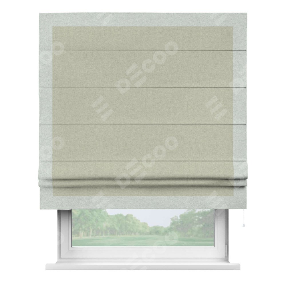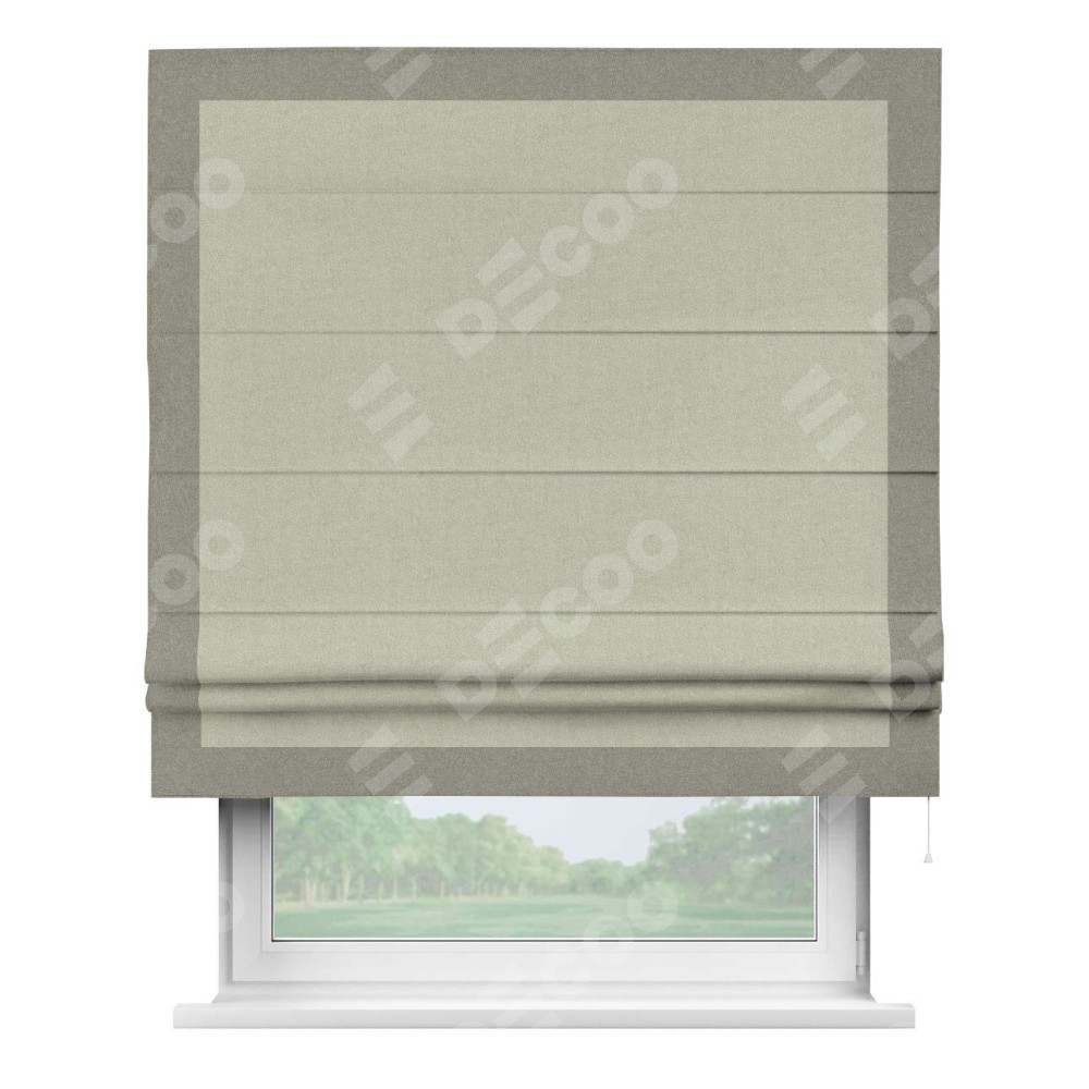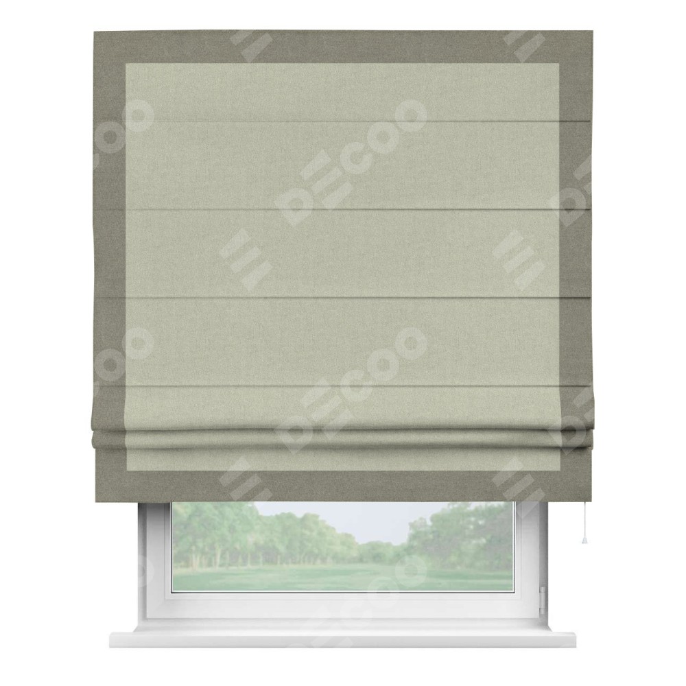 Римская штора производителя «Cortin», используется для проёма, пошита из ткани лён блэкаут серо-бежевый, артикул 69450. Отделка шторы кантом «Чесс», ткань для канта используется из льна разной расцветки на выбор. Имеет универсальный механизм и подходит для монтажа: на потолок, на стену и в нишу.