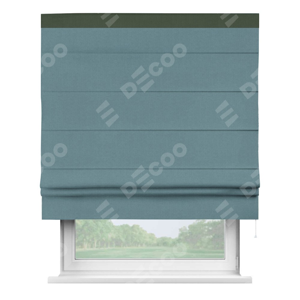 Римская штора производителя «Cortin», используется для проёма, пошита из ткани лён блэкаут синий, артикул 69528. Отделка шторы кантом «Кинг», ткань для канта используется из льна разной расцветки на выбор. Имеет универсальный механизм и подходит для монтажа: на потолок, на стену и в нишу.