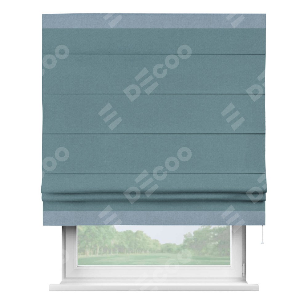 Римская штора производителя «Cortin», используется для проёма, пошита из ткани лён блэкаут синий, артикул 69528. Отделка шторы кантом «Горизонт», ткань для канта используется из льна разной расцветки на выбор. Имеет универсальный механизм и подходит для монтажа: на потолок, на стену и в нишу.