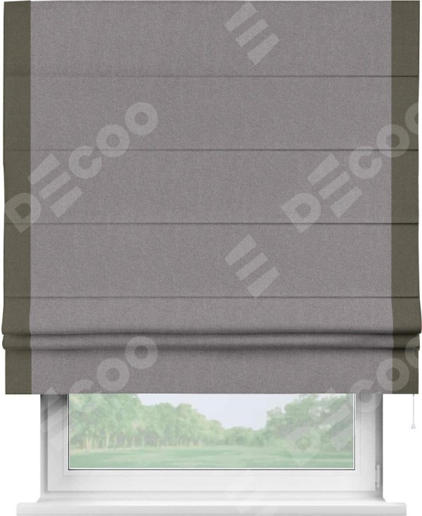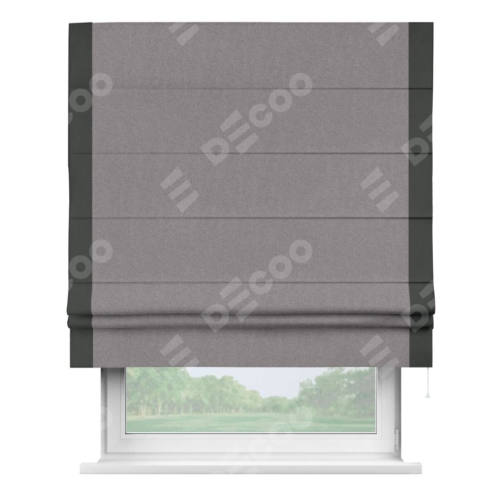 Римская штора производителя «Cortin», используется для проёма, пошита из ткани лён блэкаут сиреневый, артикул 69576. Отделка шторы кантом «Стрим Дуо», ткань для канта используется из льна разной расцветки на выбор. Имеет универсальный механизм и подходит для монтажа: на потолок, на стену и в нишу.
