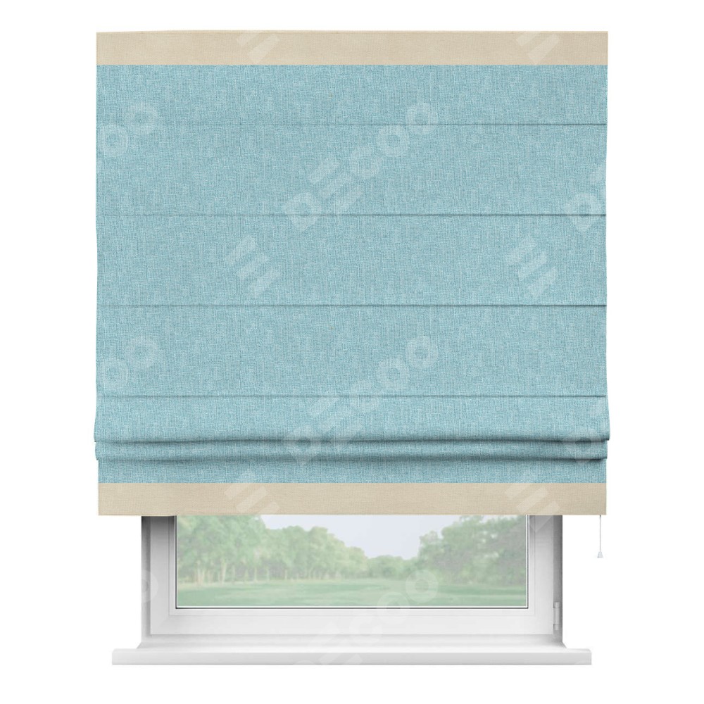 Римская штора производителя «Cortin», используется для проёма, пошита из ткани лён кашемир голубой, артикул 21616. Отделка шторы кантом «Горизонт», ткань для канта используется из льна разной расцветки на выбор. Имеет универсальный механизм и подходит для монтажа: на потолок, на стену и в нишу.