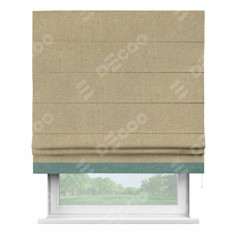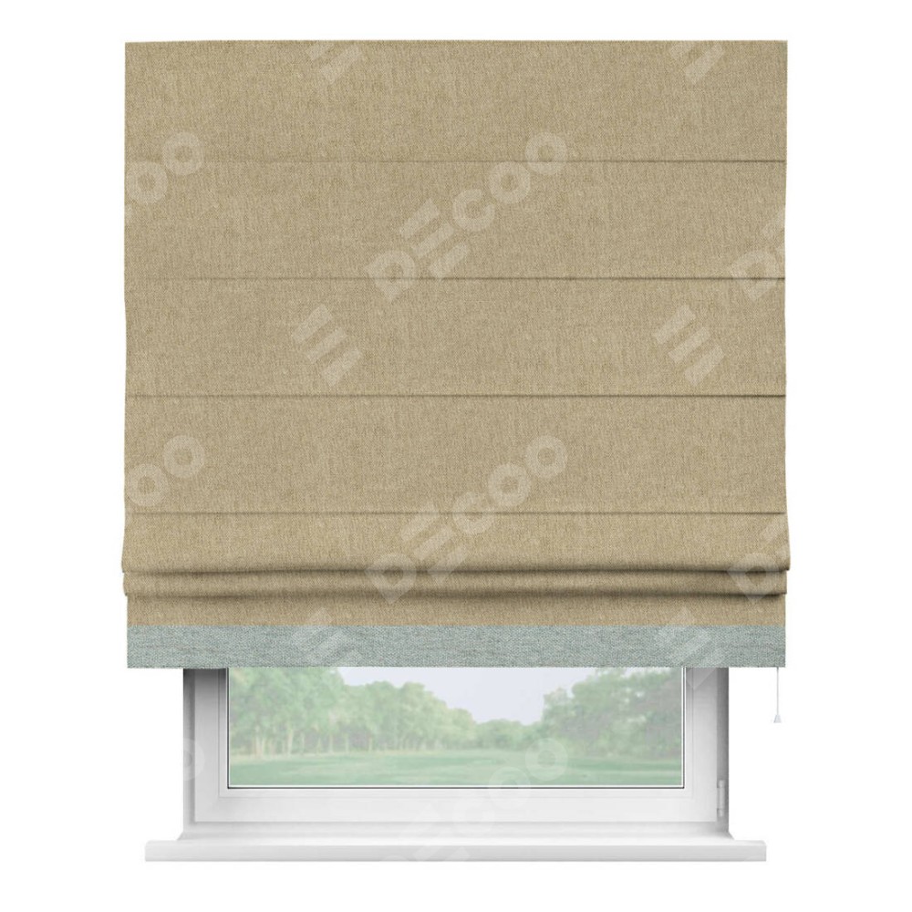 Римская штора производителя «Cortin», используется для проёма, пошита из ткани стиф димаут бежевый, артикул 18083. Отделка шторы кантом «Джестер», ткань для канта используется из стифа разной расцветки на выбор. Имеет универсальный механизм и подходит для монтажа: на потолок, на стену и в нишу.