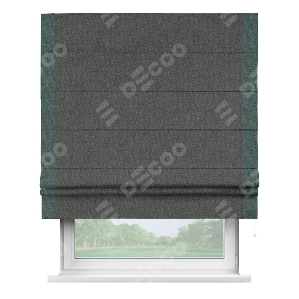 Римская штора производителя «Cortin», используется для проёма, пошита из ткани стиф димаут графит, артикул 44026. Отделка шторы кантом «Стрим Дуо», ткань для канта используется из стифа разной расцветки на выбор. Имеет универсальный механизм и подходит для монтажа: на потолок, на стену и в нишу.