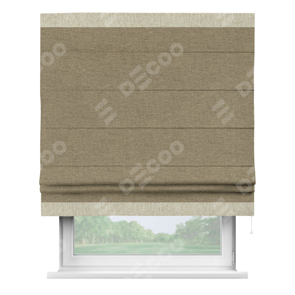Римская штора производителя «Cortin», используется для проёма, пошита из ткани стиф димаут тёмно-бежевый, артикул 18085. Отделка шторы кантом «Горизонт», ткань для канта используется из стифа разной расцветки на выбор. Имеет универсальный механизм и подходит для монтажа: на потолок, на стену и в нишу.