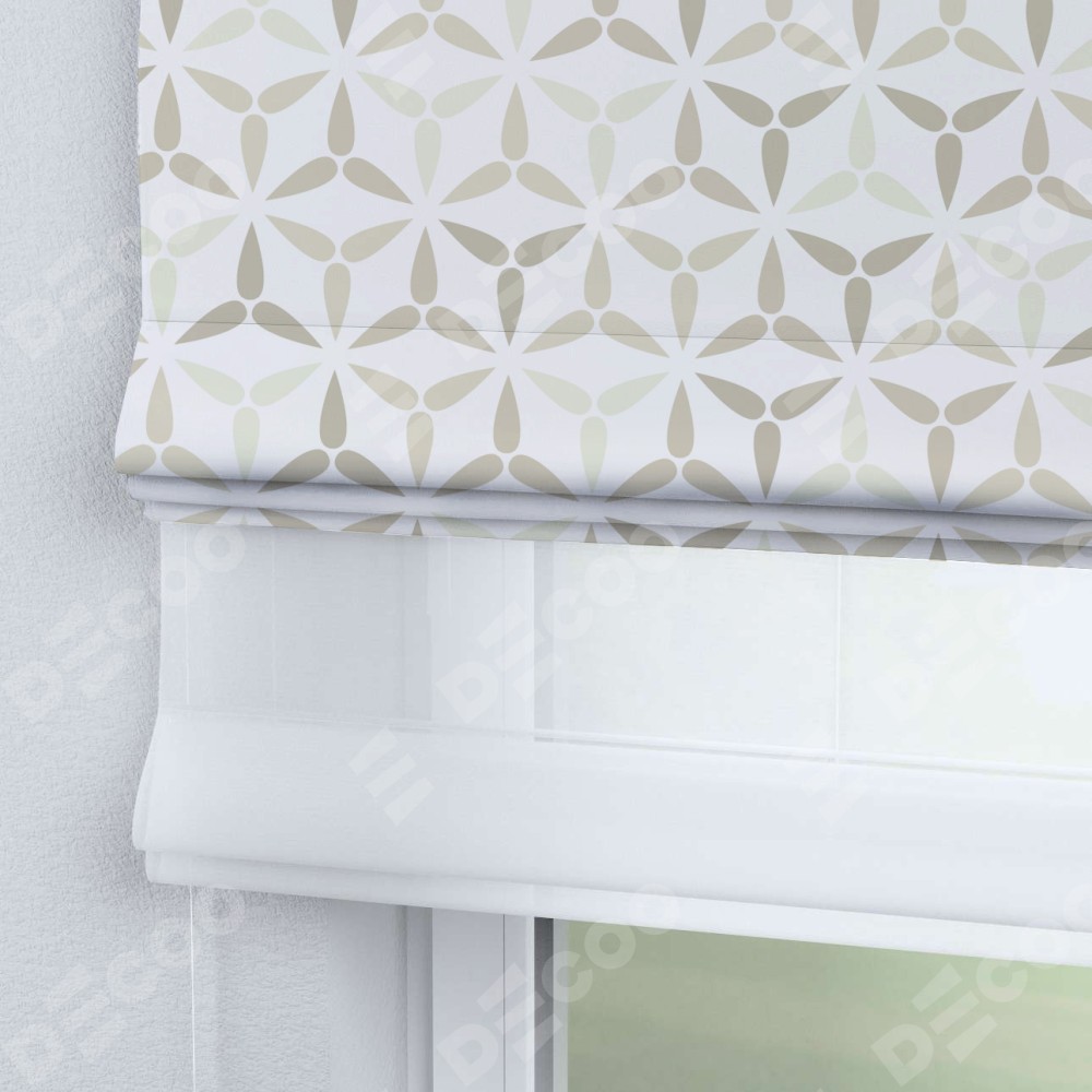 Римская штора день-ночь производителя «Cortin», используется для проёма, пошита из двух полотен, с лицевой блэкаут с нанесением сублимационной печати «Бежевая графика», вторая ткань тюль (по стандарту комплектуется тюль белого цвета артикул V-01). Имеет универсальный механизм и подходит для монтажа: на потолок, на стену и в нишу.