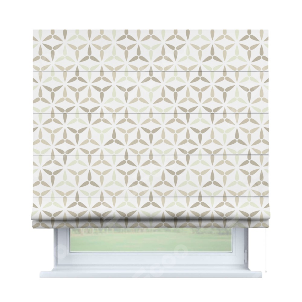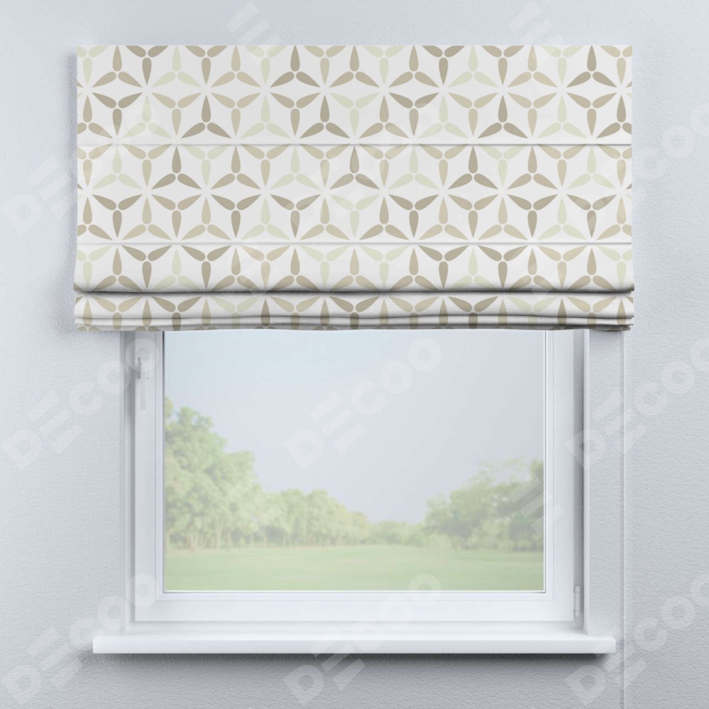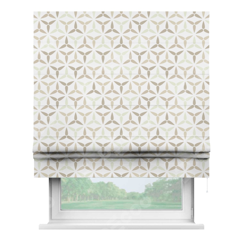 Римская штора производителя «Cortin», используется для проёма, пошита из ткани блэкаут с нанесением сублимационной печати «Бежевая графика». Имеет универсальный механизм и подходит для монтажа: на потолок, на стену и в нишу.