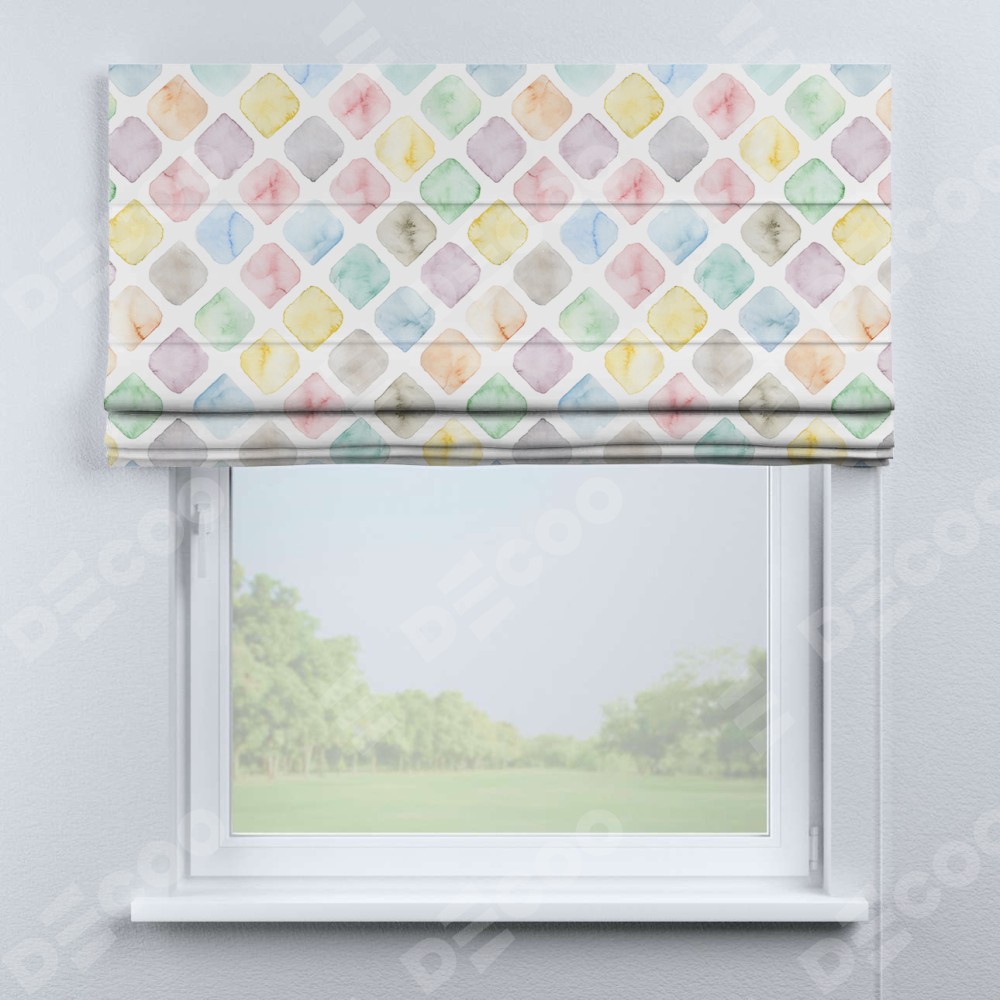 Римская штора производителя «Cortin», используется для проёма, пошита из ткани блэкаут с нанесением сублимационной печати «Мозаика акварель». Имеет универсальный механизм и подходит для монтажа: на потолок, на стену и в нишу.