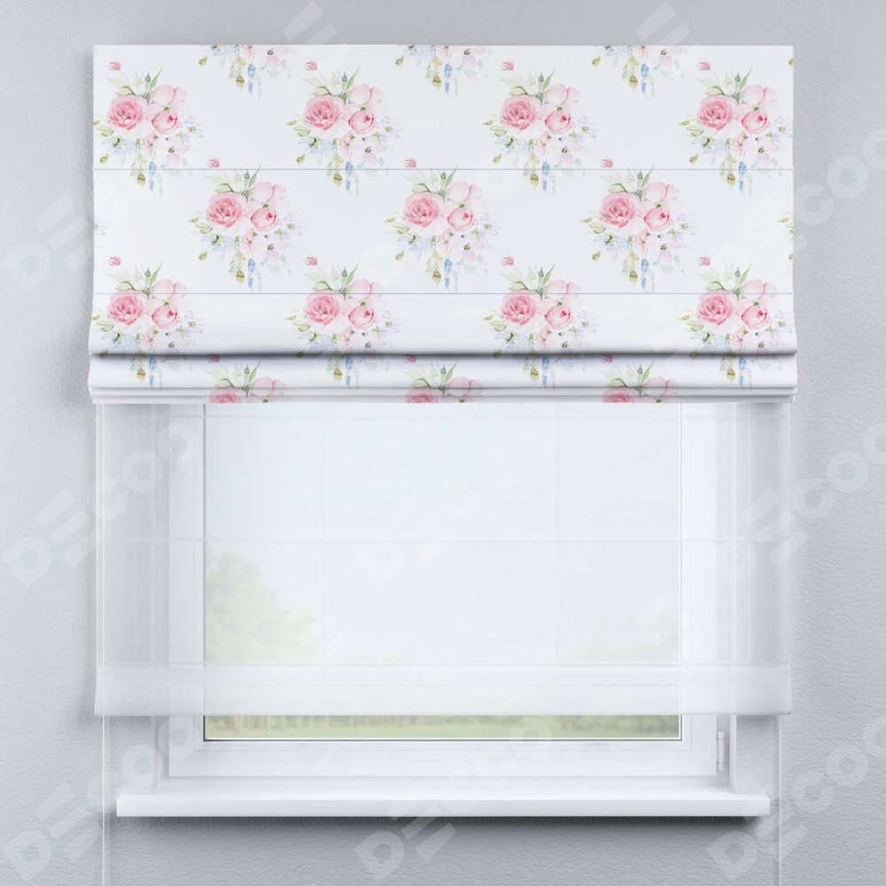 Римская штора день-ночь производителя «Cortin», используется для проёма, пошита из двух полотен, с лицевой блэкаут с нанесением сублимационной печати «Нежный розарий», вторая ткань тюль (по стандарту комплектуется тюль белого цвета артикул V-01). Имеет универсальный механизм и подходит для монтажа: на потолок, на стену и в нишу.