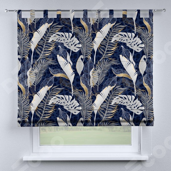 Римская штора производителя «Cortin», используется для проёма, пошита из ткани блэкаут с нанесением сублимационной печати «Сине-золотые джунгли». Данная модель пошита на петлях, комплектуется на выбор круглым карнизом и подходит для монтажа на стену. Римская штора на петлях имеет простую систему регулировки высоты, отличительным преимуществом данной модели является простой способ монтажа. Достаточно повесить ее на трубу и штора готова!