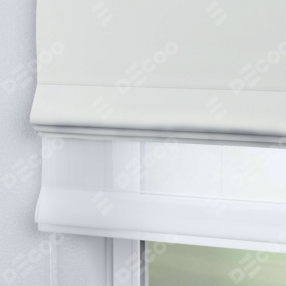 Римская штора день-ночь производителя «Cortin», используется для проёма, пошита из двух полотен, с лицевой стороны канвас молочный артикул v-93, вторая ткань тюль (по стандарту комплектуется тюль белого цвета артикул V-01). Имеет универсальный механизм и подходит для монтажа: на потолок, на стену и в нишу.