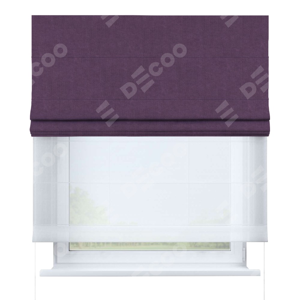 Римская штора день-ночь производителя «Cortin», используется для проёма, пошита из двух полотен, с лицевой стороны канвас сиреневый артикул v-98, вторая ткань тюль (по стандарту комплектуется тюль белого цвета артикул V-01). Имеет универсальный механизм и подходит для монтажа: на потолок, на стену и в нишу.