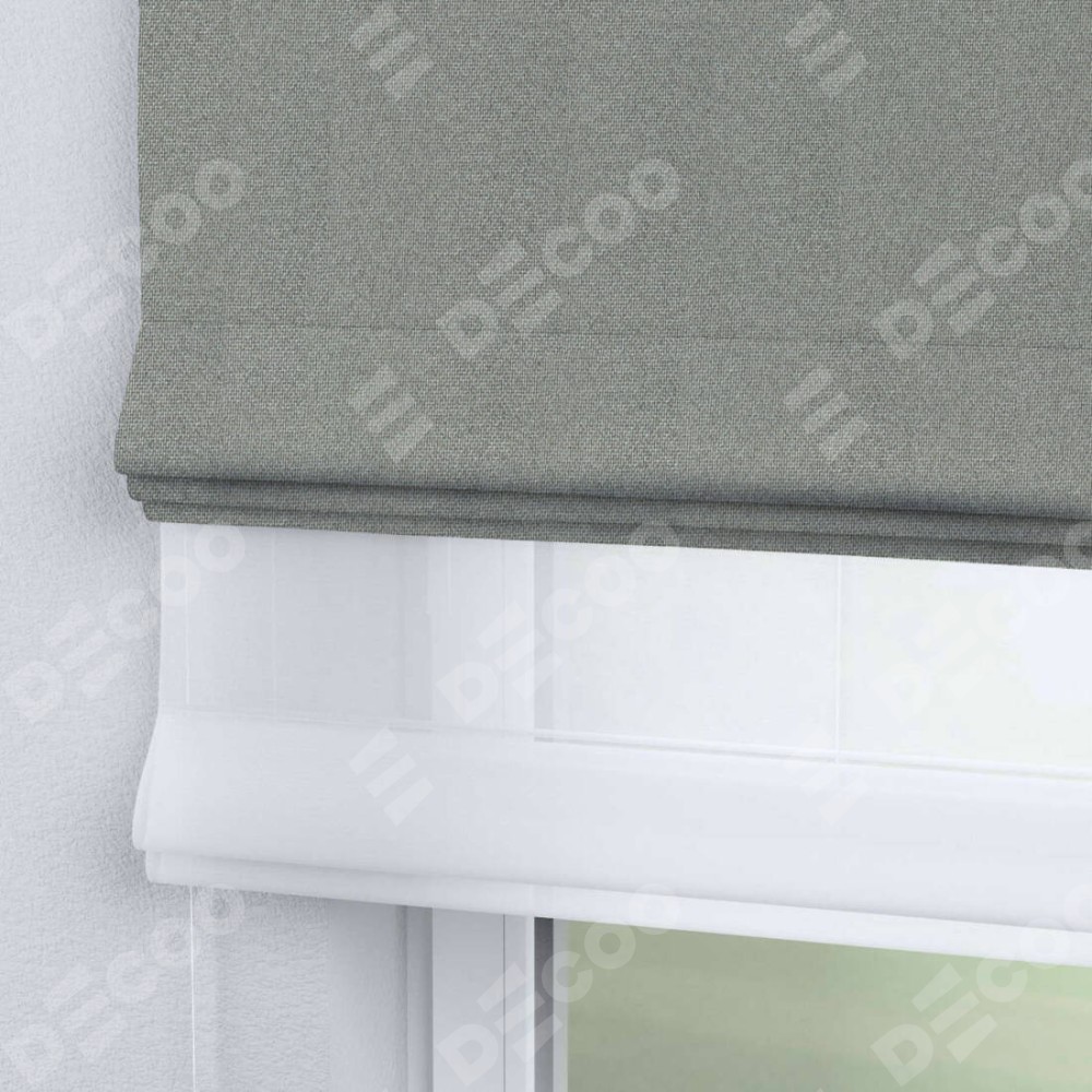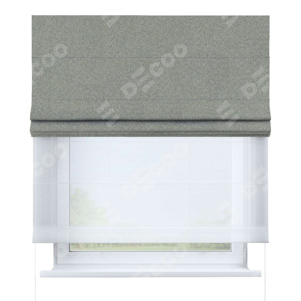 Римская штора день-ночь производителя «Cortin», используется для проёма, пошита из двух полотен, с лицевой стороны лён димаут серый артикул 91009, вторая ткань тюль (по стандарту комплектуется тюль белого цвета артикул V-01). Имеет универсальный механизм и подходит для монтажа: на потолок, на стену и в нишу.