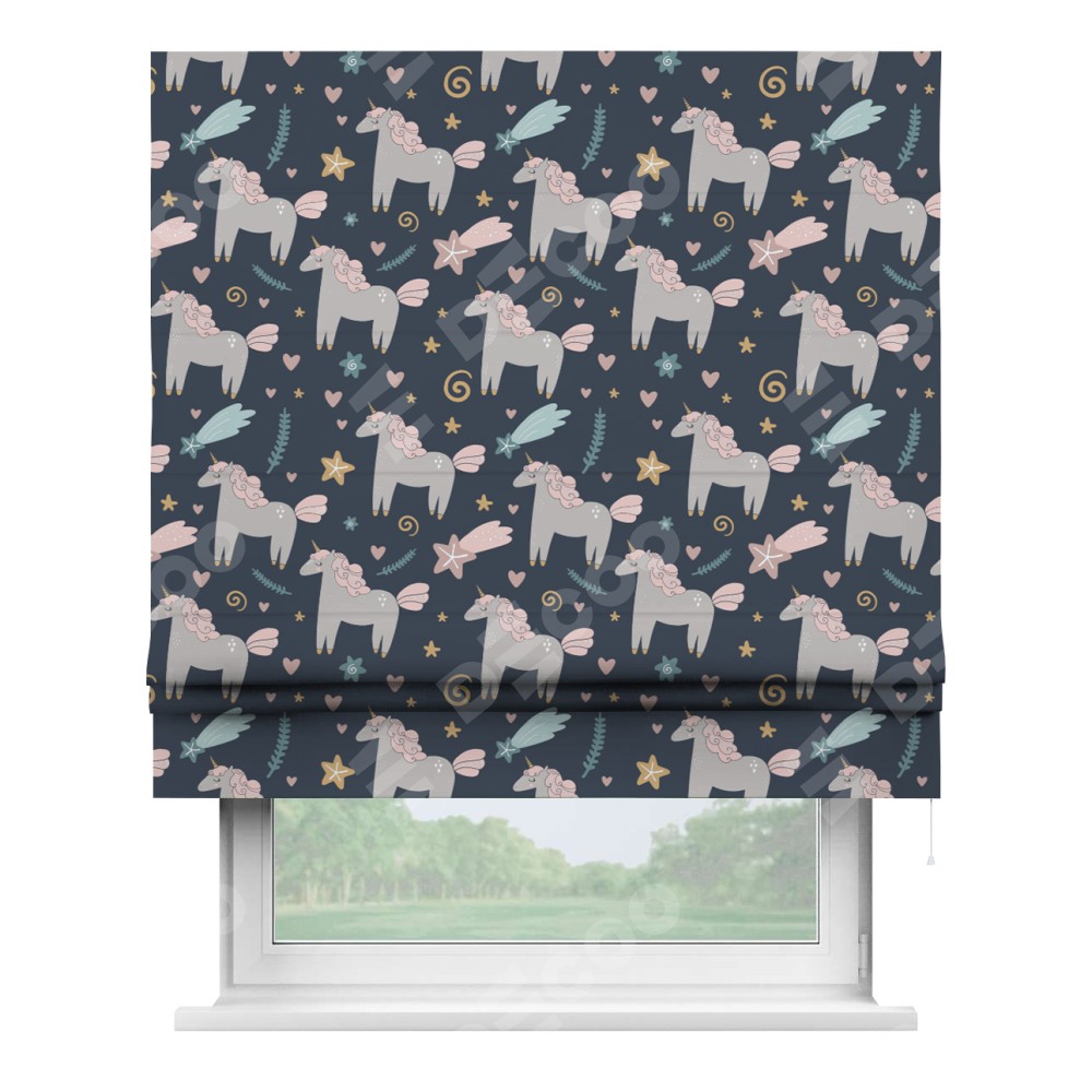 Римская штора производителя «Cortin», используется для проёма, пошита из ткани блэкаут с нанесением сублимационной печати «Милые единороги». Имеет универсальный механизм и подходит для монтажа: на потолок, на стену и в нишу.