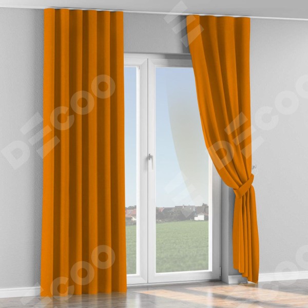 Комплект прямых штор, от производителя «Cortin», пошиты из ткани канвас оранжевый, артикул ткани v-106. С изнаночной стороны в верхней части штор пристрачивается шторная лента с декоративными складками «Волна». Для создания элегантных складок прямые шторы шьются по стандарту с коэффициентом 1:2 (на 100 см. ширины проёма 200 см. ширины ткани).