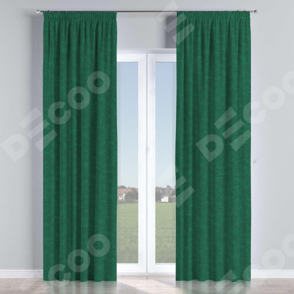 Комплект прямых штор, от производителя «Cortin», пошиты из ткани канвас тёмно-зелёный, артикул ткани v-469. С изнаночной стороны в верхней части штор пристрачивается шторная лента с декоративными складками «Карандаш». Для создания элегантных складок прямые шторы шьются по стандарту с коэффициентом 1:2 (на 100 см. ширины проёма 200 см. ширины ткани).