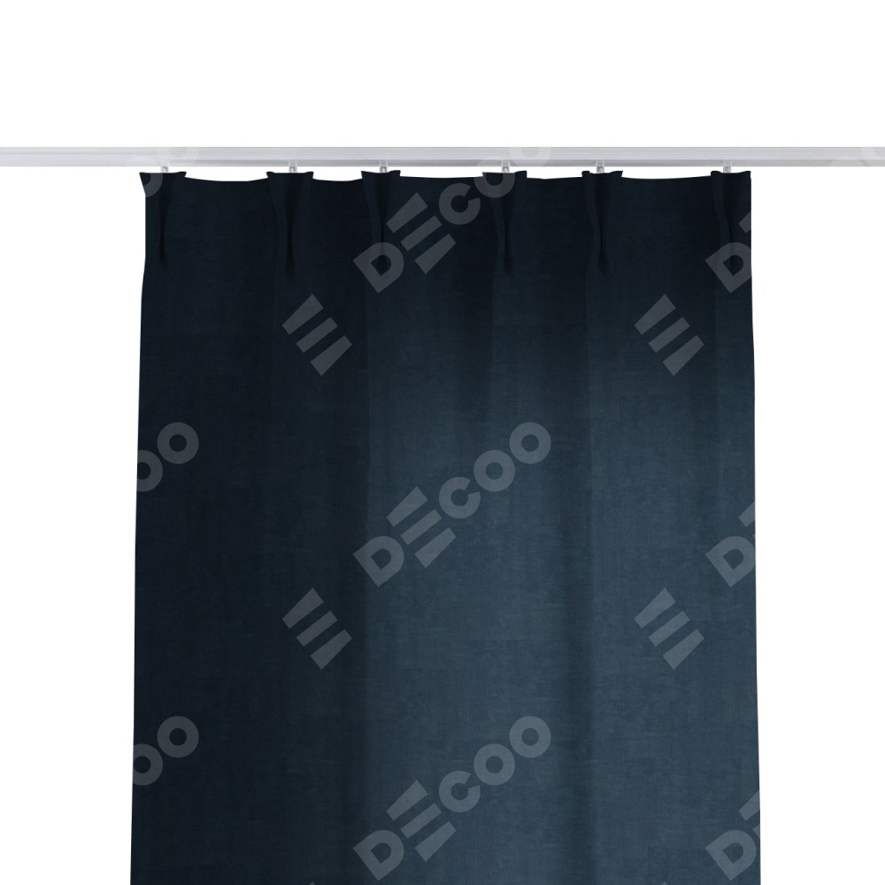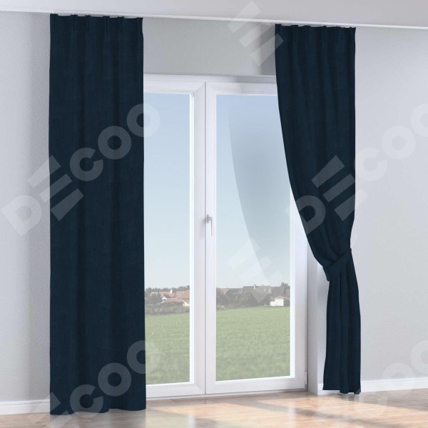 Комплект прямых штор, от производителя «Cortin», пошиты из ткани канвас тёмно-синий, артикул ткани v-206. С изнаночной стороны в верхней части штор пристрачивается шторная лента с декоративными складками «Кустик». Для создания элегантных складок прямые шторы шьются по стандарту с коэффициентом 1:2 (на 100 см. ширины проёма 200 см. ширины ткани).