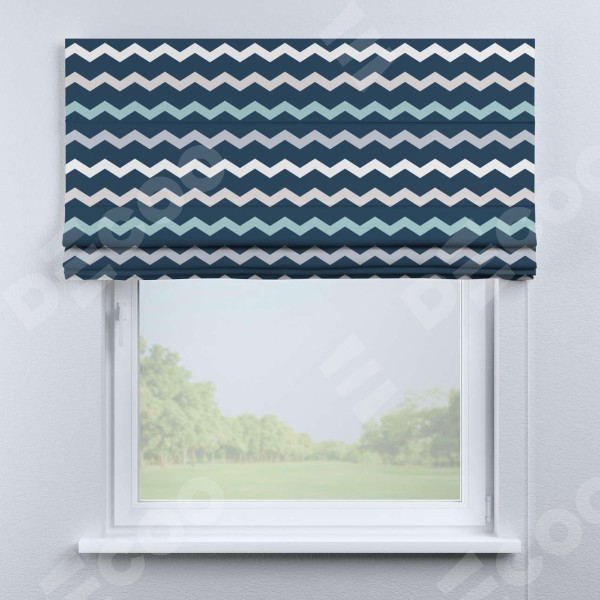 Римская штора производителя «Cortin», используется для проёма, пошита из ткани блэкаут с нанесением сублимационной печати «Морской шеврон». Имеет универсальный механизм и подходит для монтажа: на потолок, на стену и в нишу.