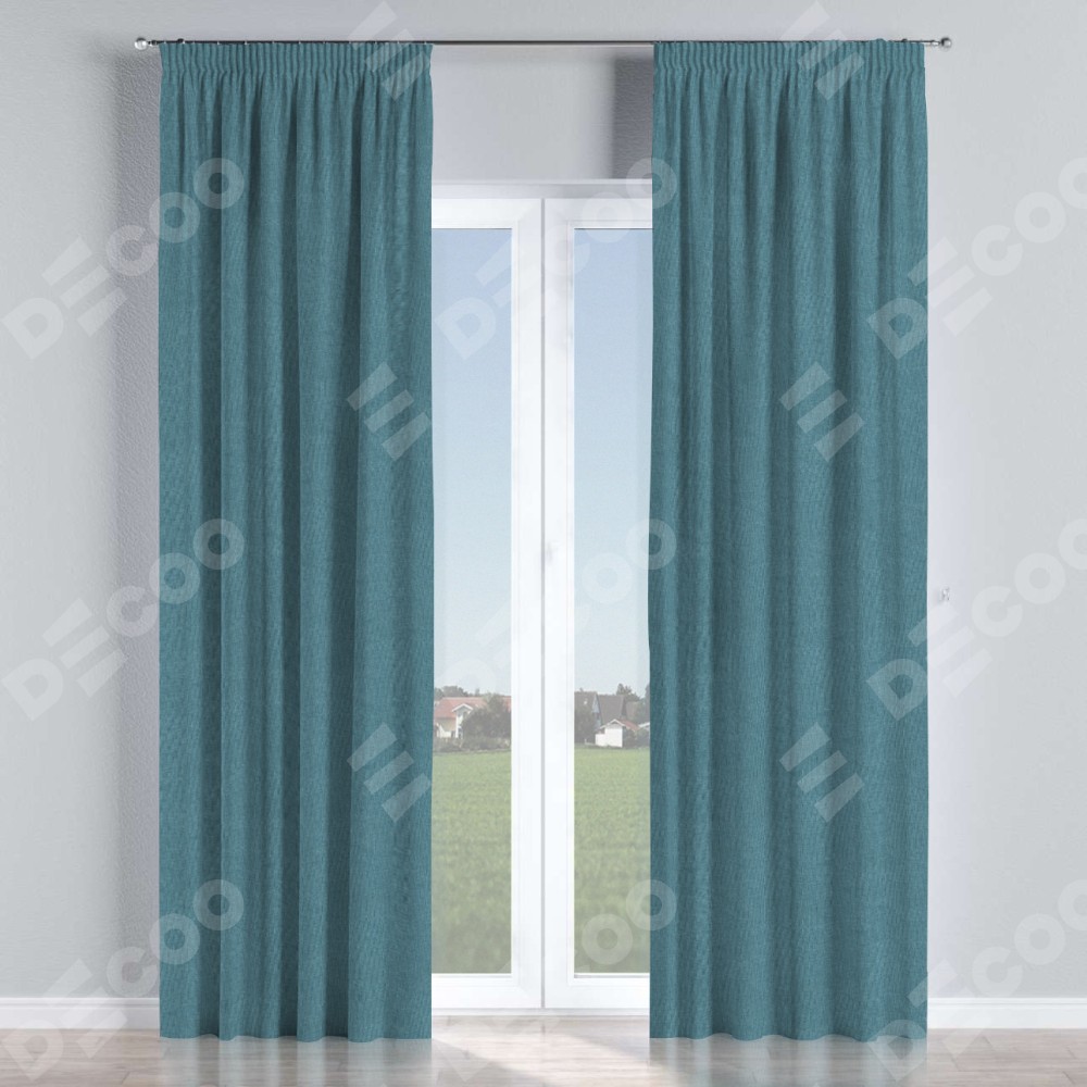 Комплект прямых штор, от производителя «Cortin», пошиты из ткани лён димаут светло-синий, артикул ткани 91007. С изнаночной стороны в верхней части штор пристрачивается шторная лента с декоративными складками «Карандаш». Для создания элегантных складок прямые шторы шьются по стандарту с коэффициентом 1:2 (на 100 см. ширины проёма 200 см. ширины ткани).