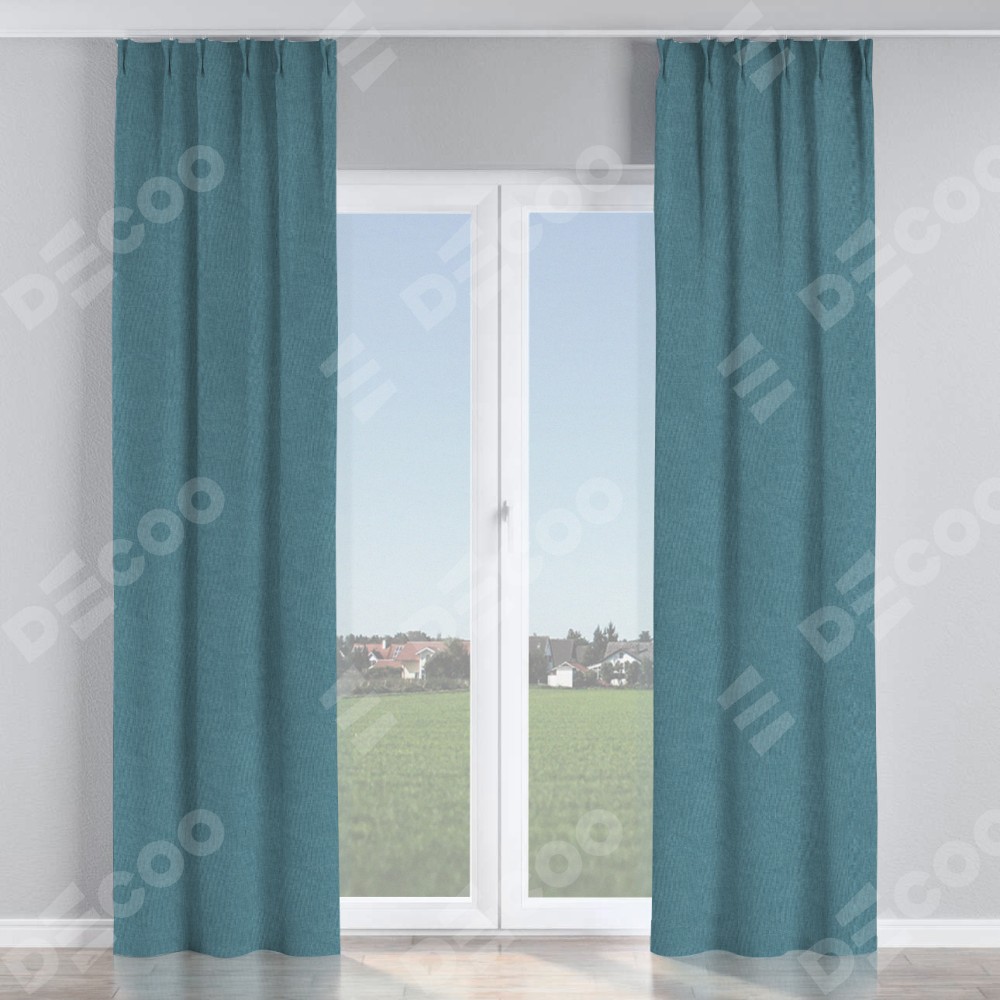 Комплект прямых штор, от производителя «Cortin», пошиты из ткани лён димаут светло-синий, артикул ткани 91007. С изнаночной стороны в верхней части штор пристрачивается шторная лента с декоративными складками «Кустик». Для создания элегантных складок прямые шторы шьются по стандарту с коэффициентом 1:2 (на 100 см. ширины проёма 200 см. ширины ткани).