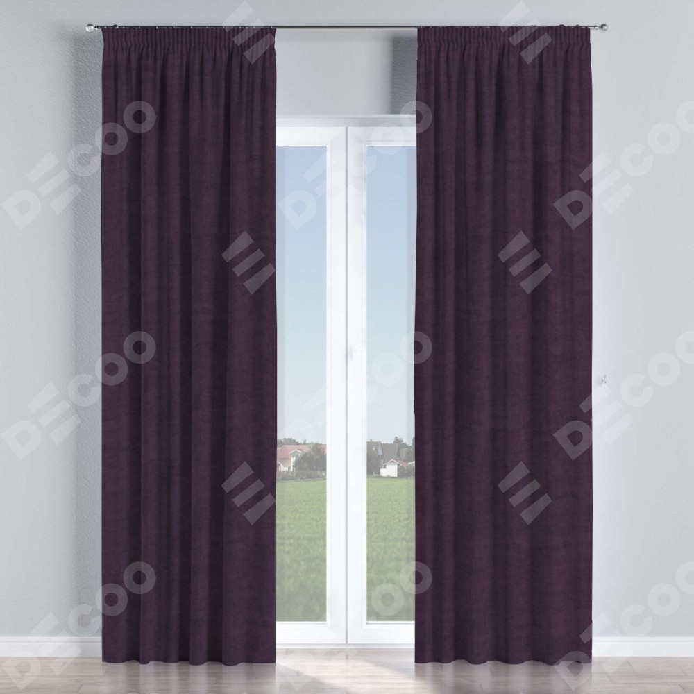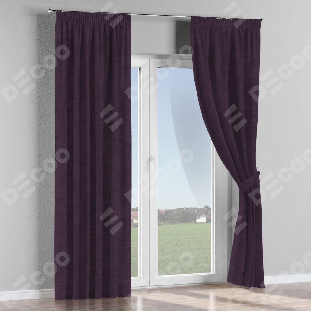Комплект прямых штор, от производителя «Cortin», пошиты из ткани вельвет тёмно-фиолетовый, артикул ткани 72403. С изнаночной стороны в верхней части штор пристрачивается шторная лента с декоративными складками «Карандаш». Для создания элегантных складок прямые шторы шьются по стандарту с коэффициентом 1:2 (на 100 см. ширины проёма 200 см. ширины ткани).