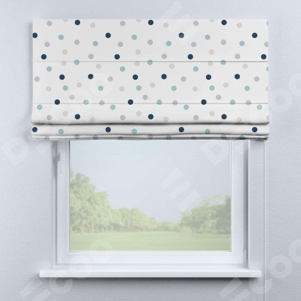 Римская штора производителя «Cortin», используется для проёма, пошита из ткани блэкаут с нанесением сублимационной печати «Точки». Имеет универсальный механизм и подходит для монтажа: на потолок, на стену и в нишу.