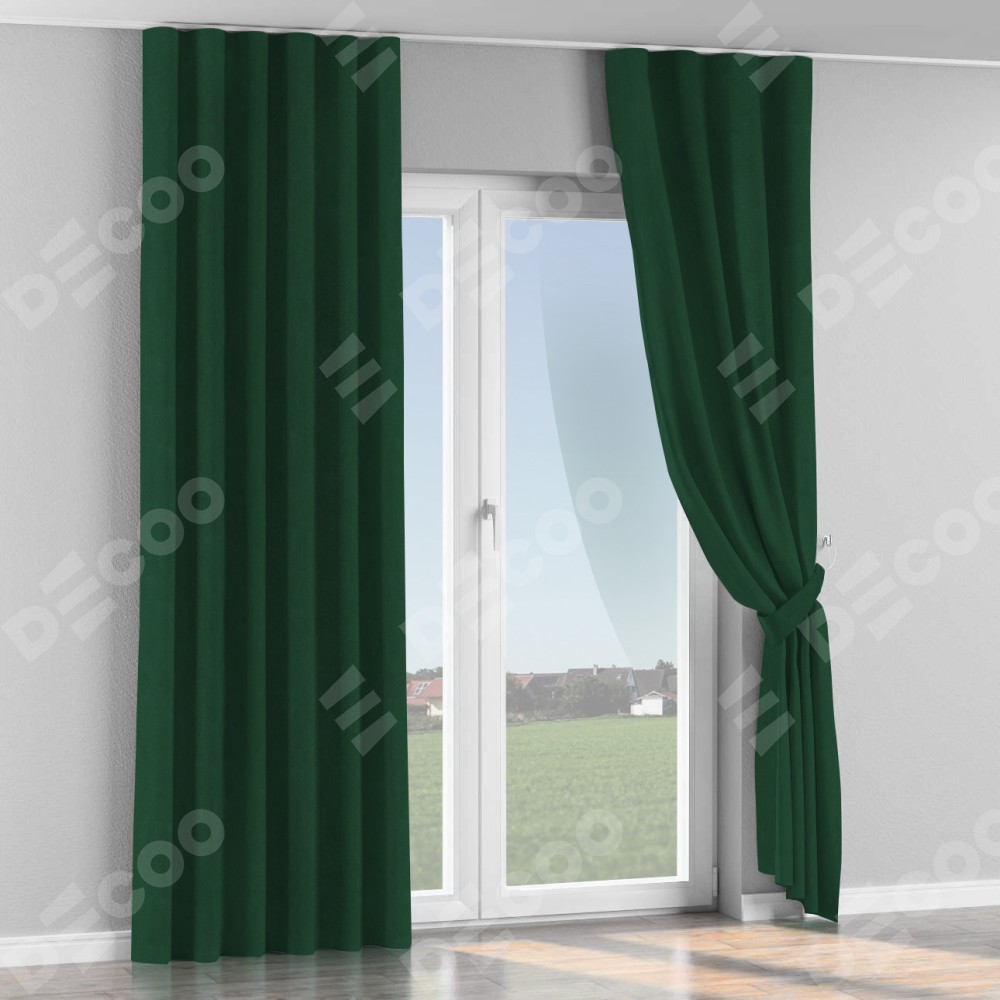 Комплект прямых штор, от производителя «Cortin», пошиты из ткани блэкаут однотонный зелёный, артикул ткани 91572−2. С изнаночной стороны в верхней части штор пристрачивается шторная лента с декоративными складками «Волна». Для создания элегантных складок прямые шторы шьются по стандарту с коэффициентом 1:2 (на 100 см. ширины проёма 200 см. ширины ткани).