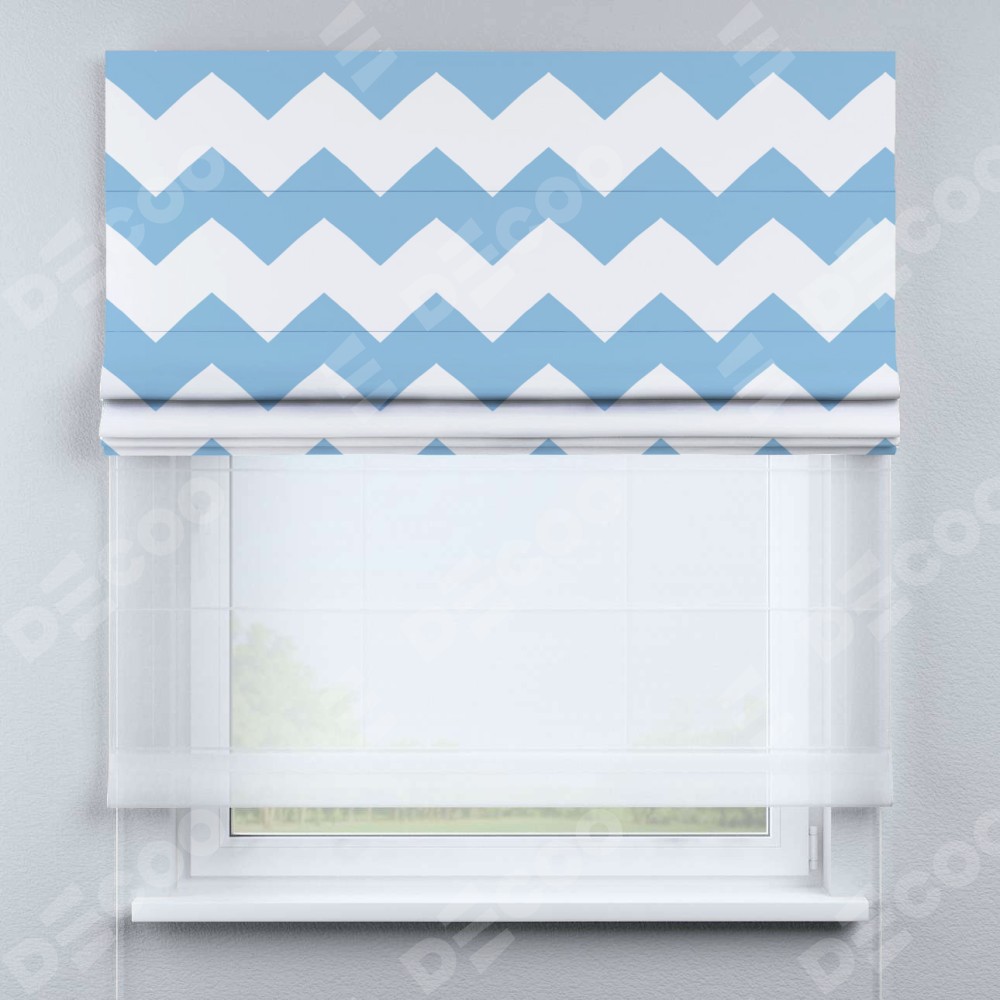 Римская штора день-ночь производителя «Cortin», используется для проёма, пошита из двух полотен, с лицевой блэкаут с нанесением сублимационной печати «Зигзаг крупный», вторая ткань тюль (по стандарту комплектуется тюль белого цвета артикул V-01). Имеет универсальный механизм и подходит для монтажа: на потолок, на стену и в нишу.