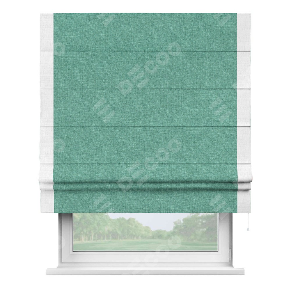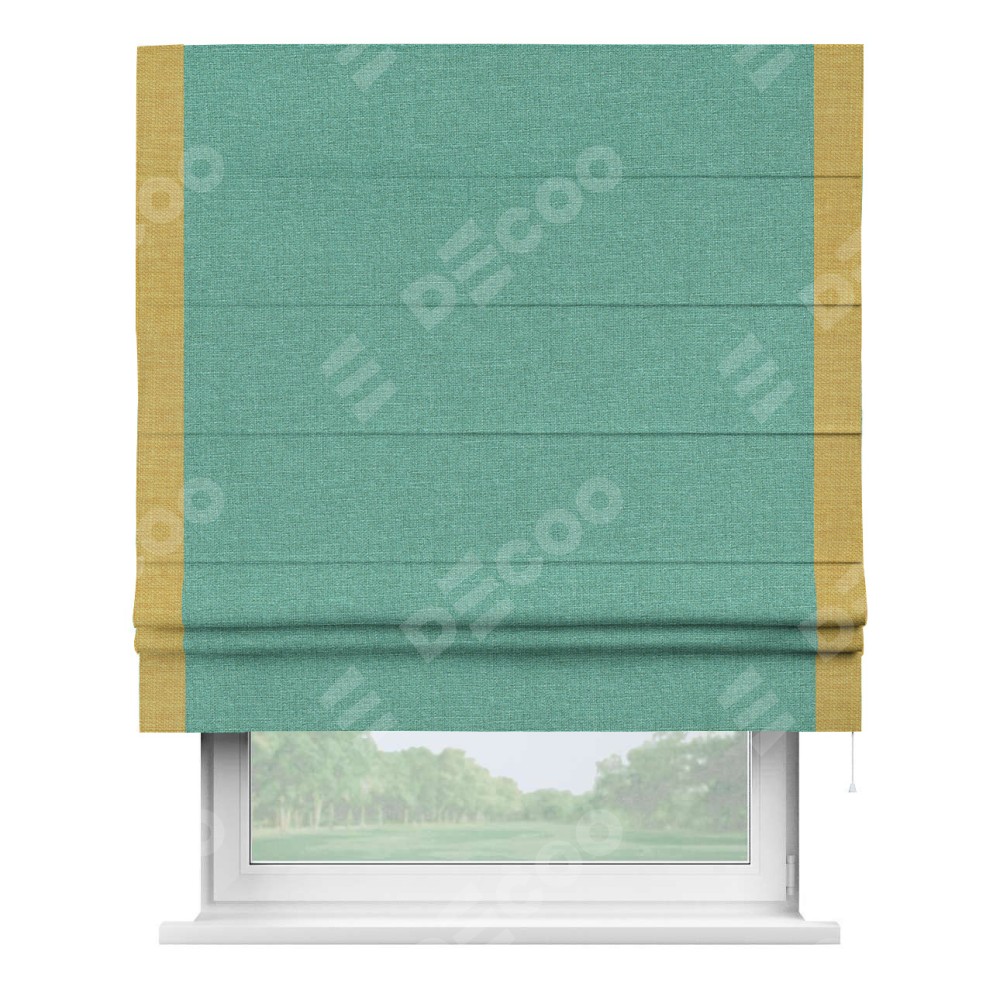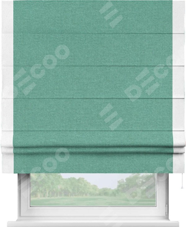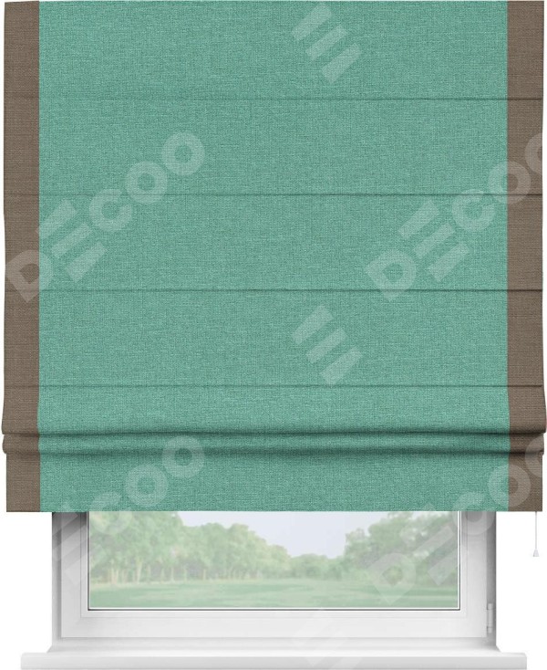 Римская штора производителя «Cortin», используется для проёма, пошита из ткани лён светло-бирюзовый, артикул 53435. Отделка шторы кантом «Стрим Дуо», ткань для канта используется из льна разной расцветки на выбор. Имеет универсальный механизм и подходит для монтажа: на потолок, на стену и в нишу.
