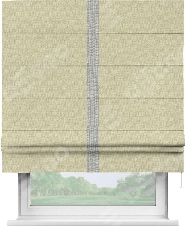 Римская штора производителя «Cortin», используется для проёма, пошита из ткани лён димаут шампань, артикул 90994. Отделка шторы кантом «Хайвэй», ткань для канта используется из льна димаут разной расцветки на выбор. Имеет универсальный механизм и подходит для монтажа: на потолок, на стену и в нишу.