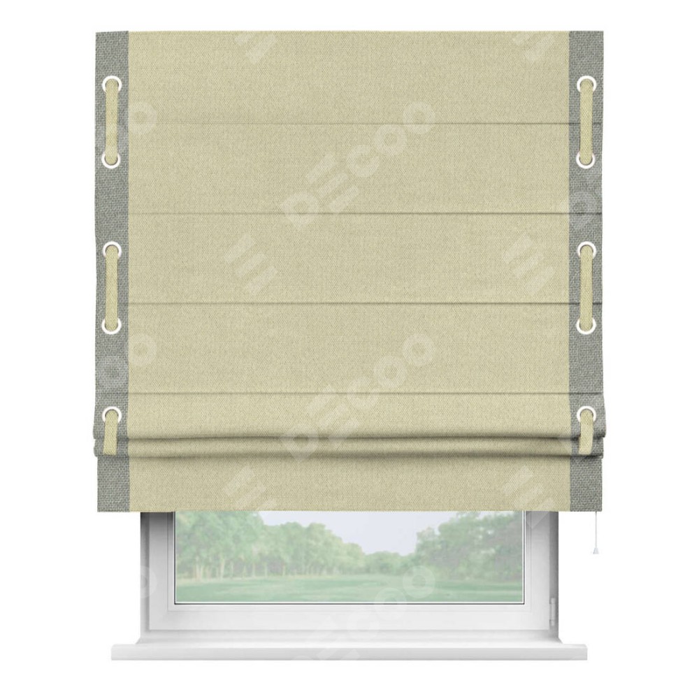 Римская штора производителя «Cortin», используется для проёма, пошита из ткани лён димаут шампань, артикул 90994. Отделка шторы кантом «Стрим Дуо» на кантах расположены люверсы с пояском, ткань для канта используется лён димаут разной расцветки на выбор. Ткань для пояска обычно используется из основной ткани шторы, а так же можно сделать из любой расцветки по желанию. Имеет универсальный механизм и подходит для монтажа: на потолок, на стену и в нишу.