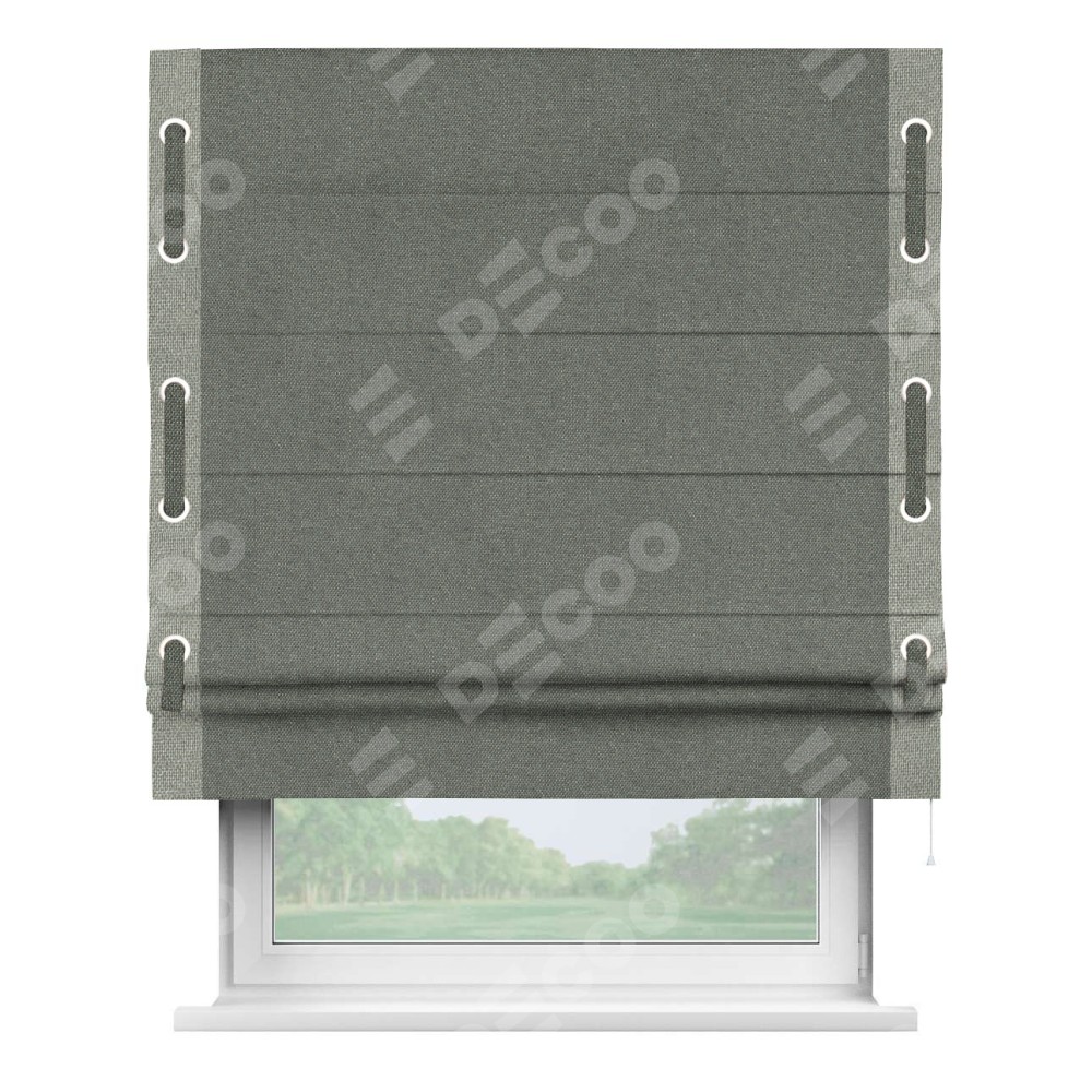 Римская штора производителя «Cortin», используется для проёма, пошита из ткани лён димаут тёмно-серый, артикул 91011. Отделка шторы кантом «Стрим Дуо» на кантах расположены люверсы с пояском, ткань для канта используется лён димаут разной расцветки на выбор. Ткань для пояска обычно используется из основной ткани шторы, а так же можно сделать из любой расцветки по желанию. Имеет универсальный механизм и подходит для монтажа: на потолок, на стену и в нишу.