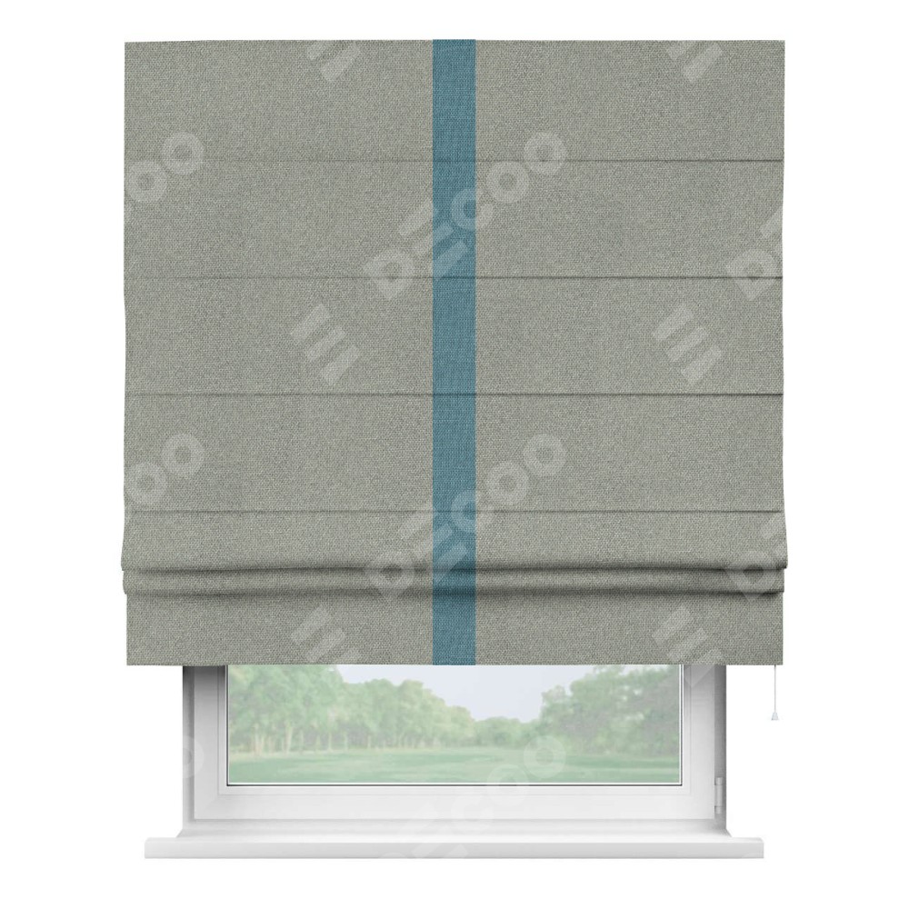 Римская штора производителя «Cortin», используется для проёма, пошита из ткани лён димаут серый, артикул 91009. Отделка шторы кантом «Хайвэй», ткань для канта используется из льна димаут разной расцветки на выбор. Имеет универсальный механизм и подходит для монтажа: на потолок, на стену и в нишу.