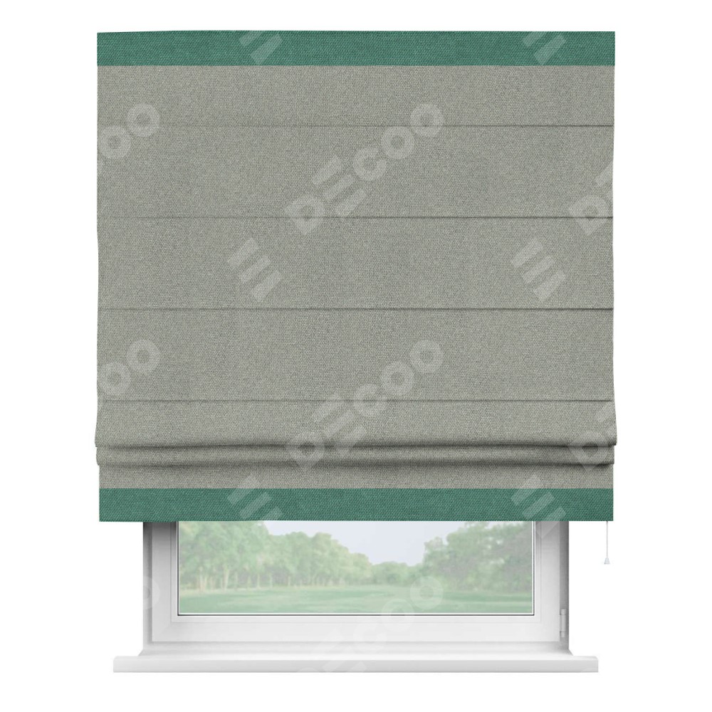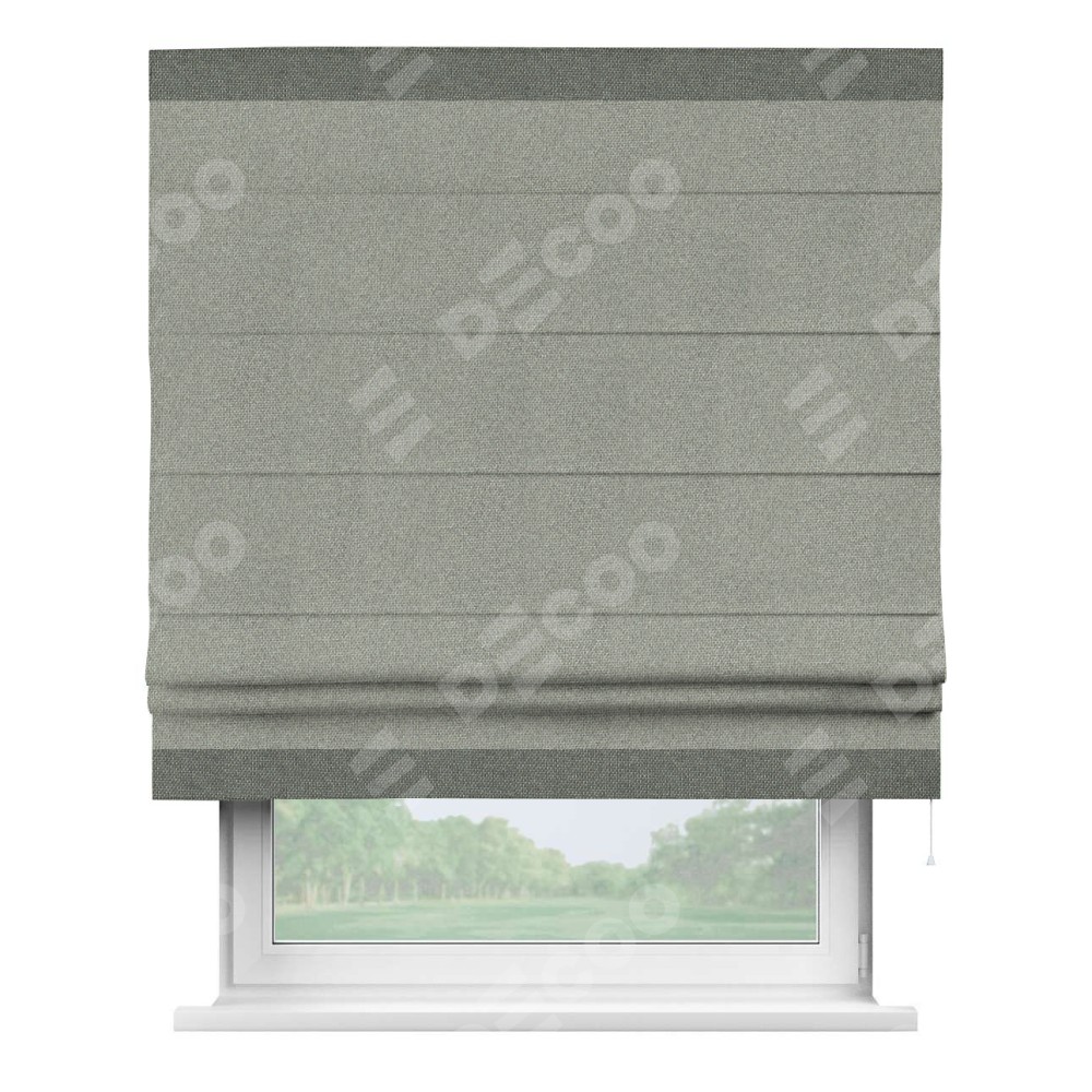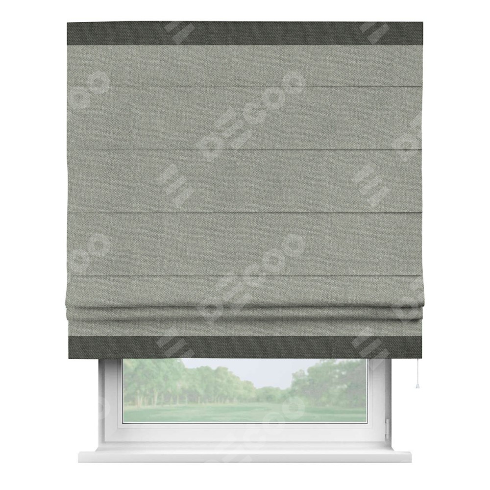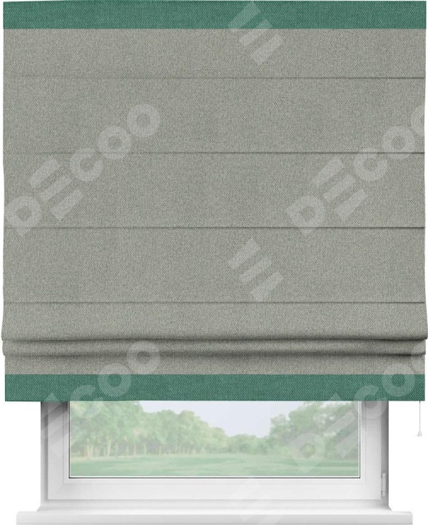 Римская штора производителя «Cortin», используется для проёма, пошита из ткани лён димаут серый, артикул 91009. Отделка шторы кантом «Горизонт», ткань для канта используется из льна димаут разной расцветки на выбор. Имеет универсальный механизм и подходит для монтажа: на потолок, на стену и в нишу.