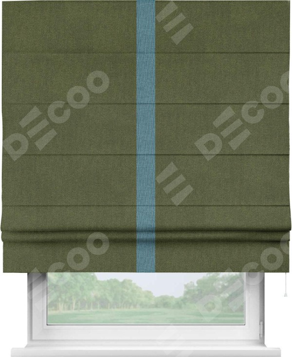 Римская штора производителя «Cortin», используется для проёма, пошита из ткани лён димаут салатовый, артикул 91002. Отделка шторы кантом «Хайвэй», ткань для канта используется из льна димаут разной расцветки на выбор. Имеет универсальный механизм и подходит для монтажа: на потолок, на стену и в нишу.