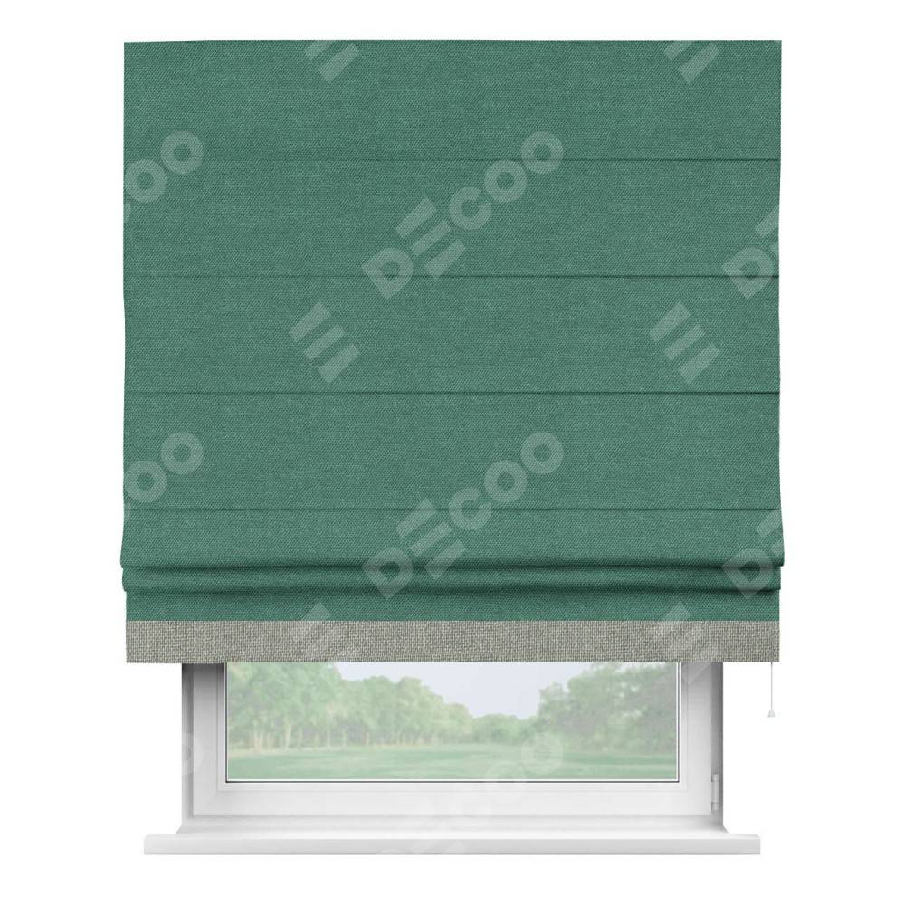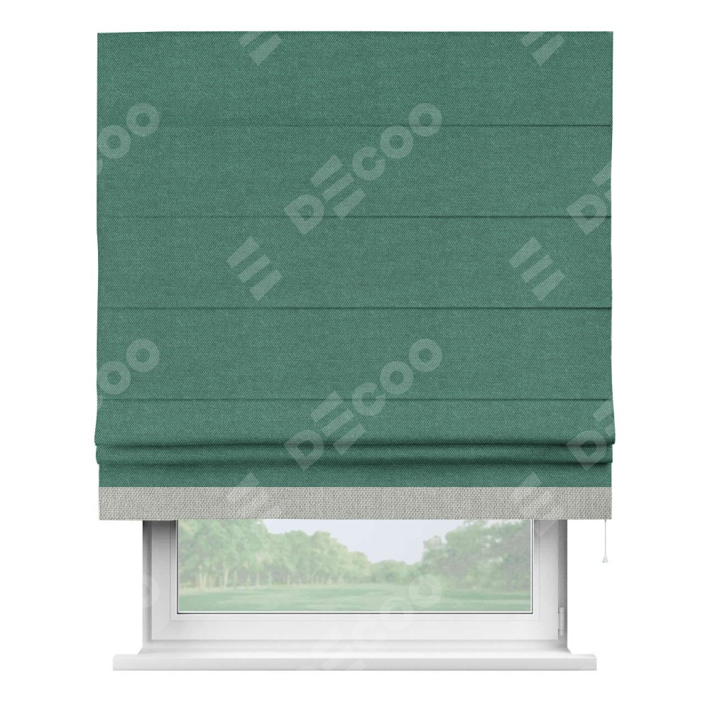 Римская штора производителя «Cortin», используется для проёма, пошита из ткани лён димаут светло-бирюзовый, артикул 91005. Отделка шторы кантом «Джестер», ткань для канта используется из льна димаут разной расцветки на выбор. Имеет универсальный механизм и подходит для монтажа: на потолок, на стену и в нишу.