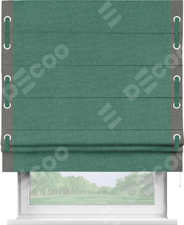 Римская штора «Кортин» для проема, лён димаут светло-бирюзовый с кантом Стрим Дуо (люверсы с пояском)