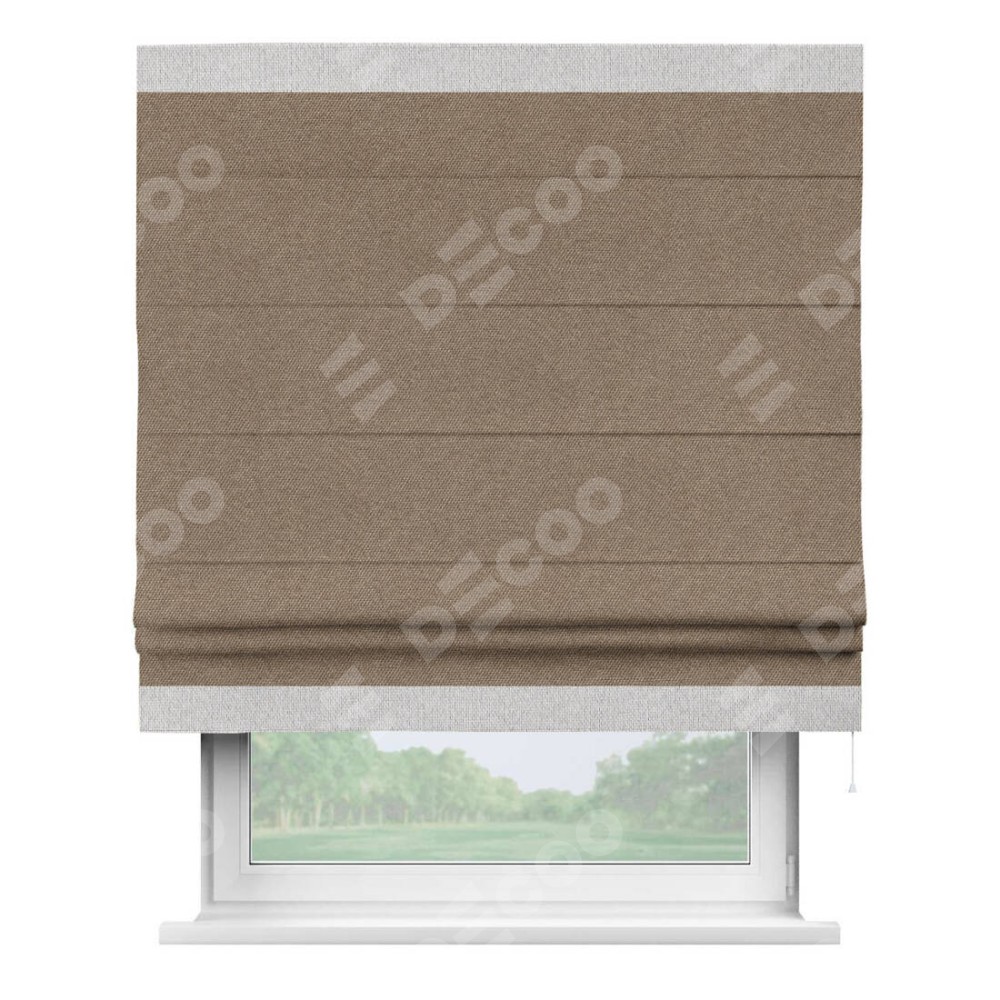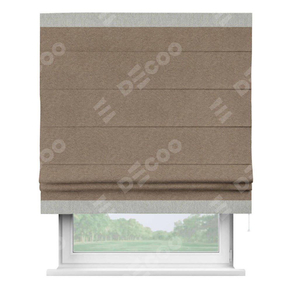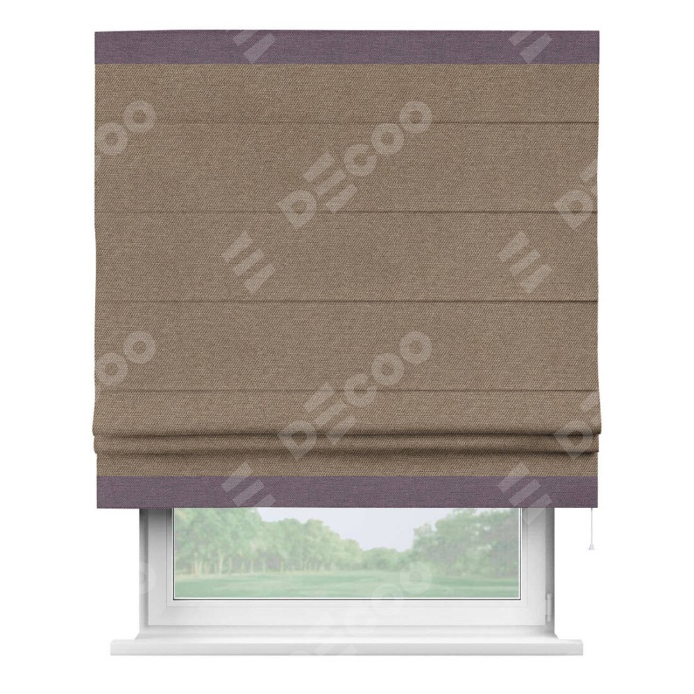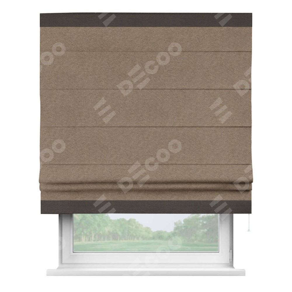 Римская штора производителя «Cortin», используется для проёма, пошита из ткани лён димаут коричневый, артикул 90996. Отделка шторы кантом «Горизонт», ткань для канта используется из льна димаут разной расцветки на выбор. Имеет универсальный механизм и подходит для монтажа: на потолок, на стену и в нишу.
