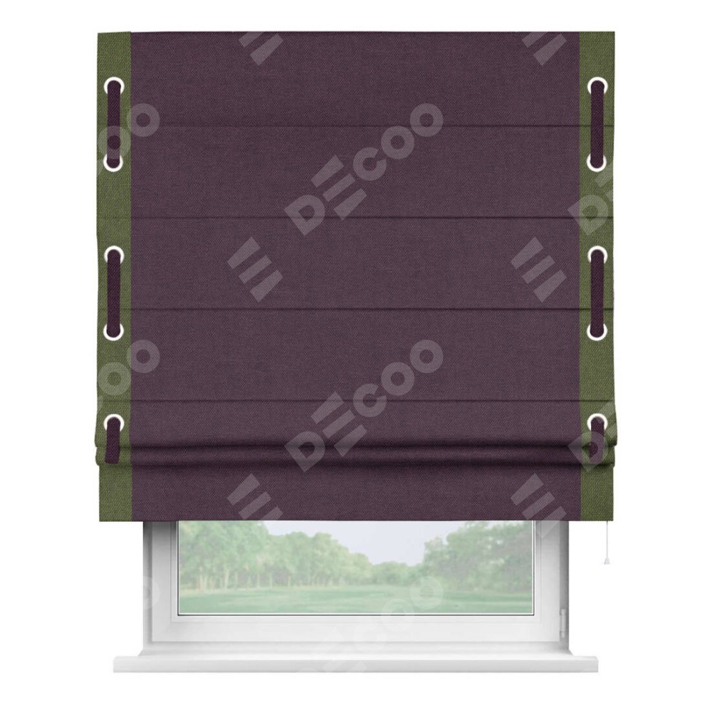 Римская штора производителя «Cortin», используется для проёма, пошита из ткани лён димаут фиолетовый, артикул 16267. Отделка шторы кантом «Стрим Дуо» на кантах расположены люверсы с пояском, ткань для канта используется лён димаут разной расцветки на выбор. Ткань для пояска обычно используется из основной ткани шторы, а так же можно сделать из любой расцветки по желанию. Имеет универсальный механизм и подходит для монтажа: на потолок, на стену и в нишу.