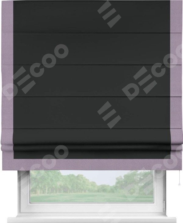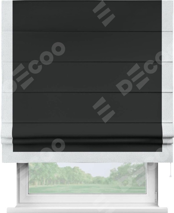 Римская штора производителя «Cortin», используется для проёма, пошита из ткани блэкаут однотонный черный, артикул ткани 91571−2. Отделка шторы кантом «Виктория», ткань для канта используется из блэкаута однотонного разной расцветки на выбор. Имеет универсальный механизм и подходит для монтажа: на потолок, на стену и в нишу.