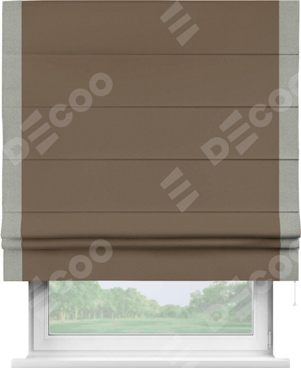 Римская штора производителя «Cortin», используется для проёма, пошита из ткани блэкаут однотонный коричневый, артикул ткани 91334. Отделка шторы кантом «Стрим Дуо», ткань для канта используется из блэкаута однотонного разной расцветки на выбор. Имеет универсальный механизм и подходит для монтажа: на потолок, на стену и в нишу.