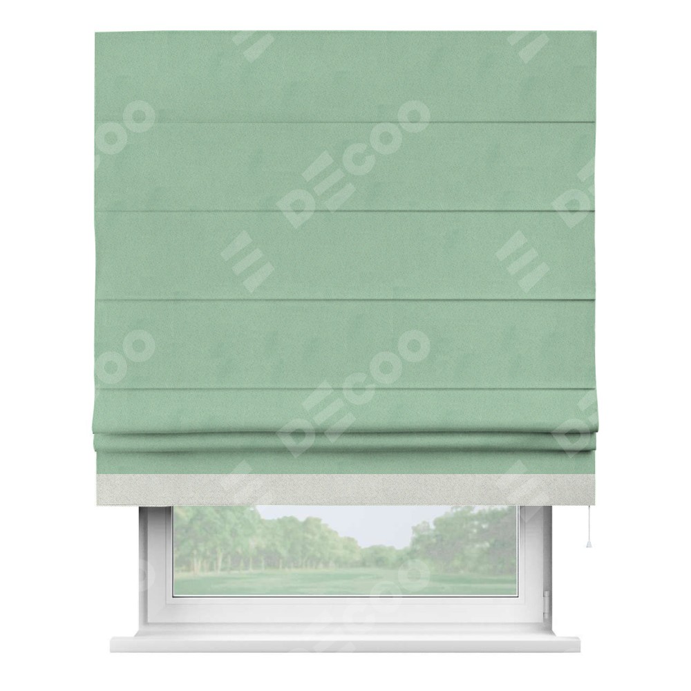 Римская штора производителя «Cortin», используется для проёма, пошита из ткани блэкаут однотонный ментоловый, артикул ткани 91572−1. Отделка шторы кантом «Джестер», ткань для канта используется из блэкаута однотонного разной расцветки на выбор. Имеет универсальный механизм и подходит для монтажа: на потолок, на стену и в нишу.